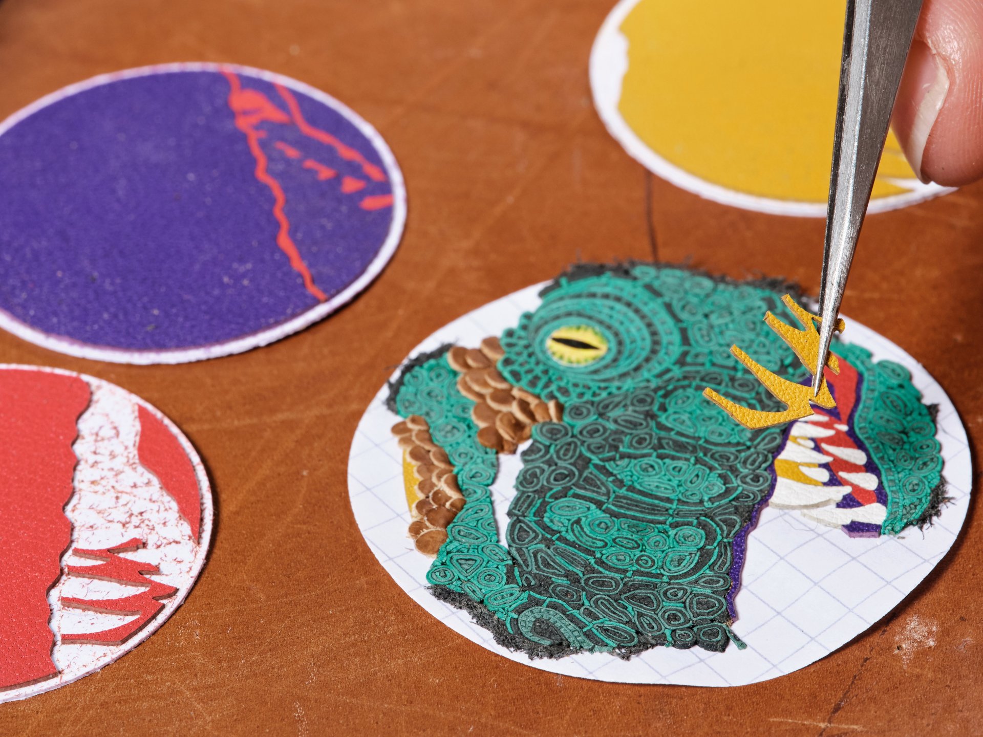การออกแบบไทแรนโนซอรัสที่ดูเหมือนการมองเห็นมันผ่านช่องหน้าต่างวงกลม โดดเด่นเหนือฝาครอบและเชื่อมโยงถึงการผสมผสานทักษะความชำนาญที่หลากหลาย ส่วนหัวและเกล็ดรังสรรค์จากหนังด้วยเทคนิคโมเสก: ชิ้นส่วนของหนังหลากสีที่ตัดเย็บด้วยมืออย่างประณีตหลายพันชิ้นถูกประกอบเข้าทีละชิ้นเพื่อสร้างลวดลายดั้งเดิมได้อย่างไม่น่าเชื่อ ดวงตาทรงโดมของไดโนเสาร์มองเห็นได้จากทั้งสองด้านของฝาปิด รังสรรค์จากลงยาเทคนิค กรองด์ เฟอ (Grand Feu) เจียระไนทรงหลังเบี้ย ส่วนขากรรไกรและลิ้นสร้างสรรค์จากงานตัดต่อลายจากแผ่นหนัง: ชิ้นหนังชั้นดีที่ตัดจากหนังหลากสีสัน จากชิ้นหนังที่มีความบางเฉียบเพียง 0.5 มิลลิเมตร นำมาวางบนฐานลงยา ให้สัมผัสของงานศิลปะจากหนังขนาดย่อส่วน จับคู่กับสายหนังจระเข้สีเขียวที่ยึดกับข้อต่อทรงโกลนสี่เหลียมและขับความโดดเด่นให้กับงานออกแบบโดยรวม