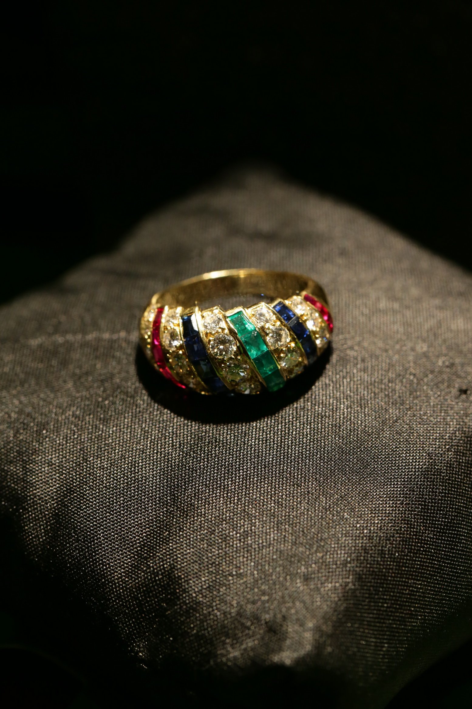 12. Cartier, London, A Gem and Diamond Cocktail Ring ค.ศ.1960 (พ. ศ. 2503) แหวนค็อกเทลวินเทจ ประดับเพชร 1.5 กะรัต สลับทับทิบและแซฟไฟร์สีเขียวเจียระไนทรงเหลี่ยม เก็บรักษาอย่างดีในกล่องหนังสีแดงของ แบรนด์คาร์เทียร์ ลอนดอน