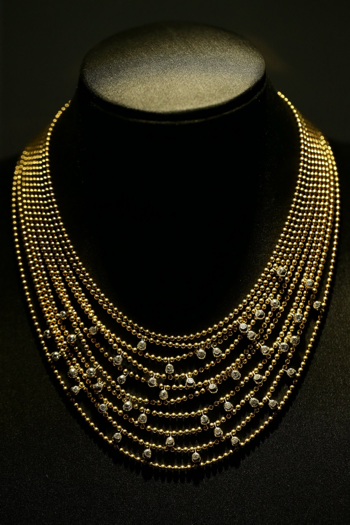 14. Cartier, A Gold and Diamond “Draperie” Necklace สร้อยคอทองประดับเพชรคาร์เทียร์ ดีไซน์คลาสสิกด้วยโซ่ลูกปัดทรงกลมขัดเงา 10 เส้น เรียงร้อยจนเกิดมิติ ประดับเพชร ประมาณ 2.10-2.30 กะรัต