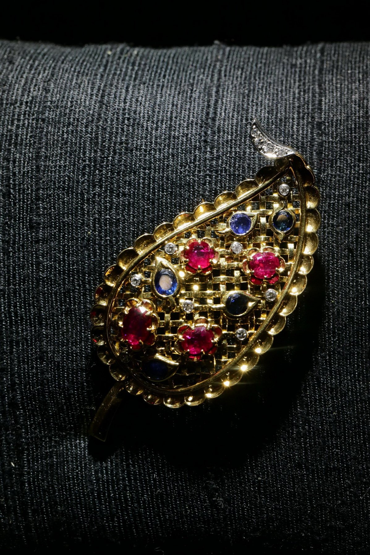 16. Cartier, A Mid-20th Century Sapphire, Ruby and Diamond Leaf Brooch เข็มกลัดรูปใบไม้วินเทจชิ้นนี้สร้างขึ้นในปี ค.ศ.1950 (พ.ศ. 2493) โดยดีไซน์คล้ายสัญลักษณ์ Buta (บูตา) ในภาษาสันสกฤตแปลว่า "ไฟ"