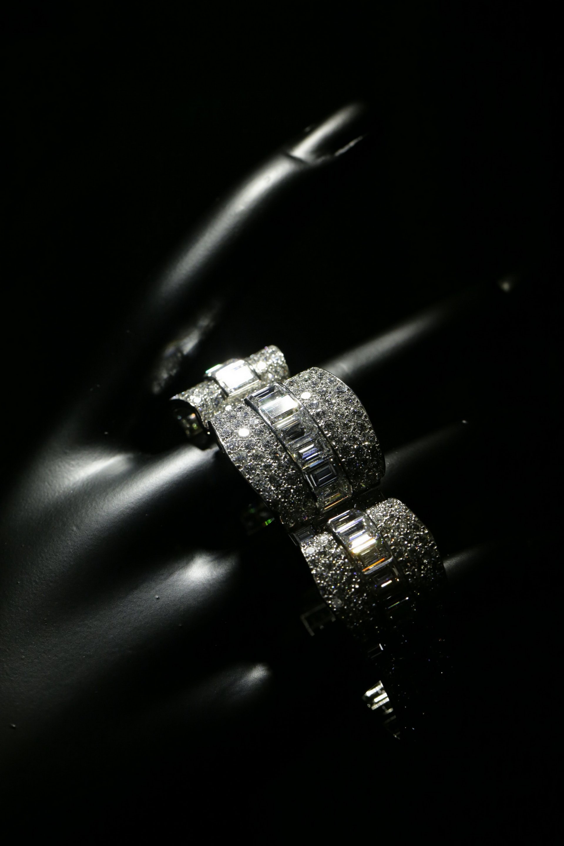 18. Cartier, Paris, An Art Deco Diamond Bracelet จาก ค.ศ. 1930 (พ.ศ. 2473) สร้อยข้อมือประดับเพชรสไตล์อาร์ตเดโค (Art Deco) ประกอบด้วยเพชรเจียระไนแบบโรสคัทและเพชรทรงกลม น้ำหนักประมาณ 22 – 24 กะรัต