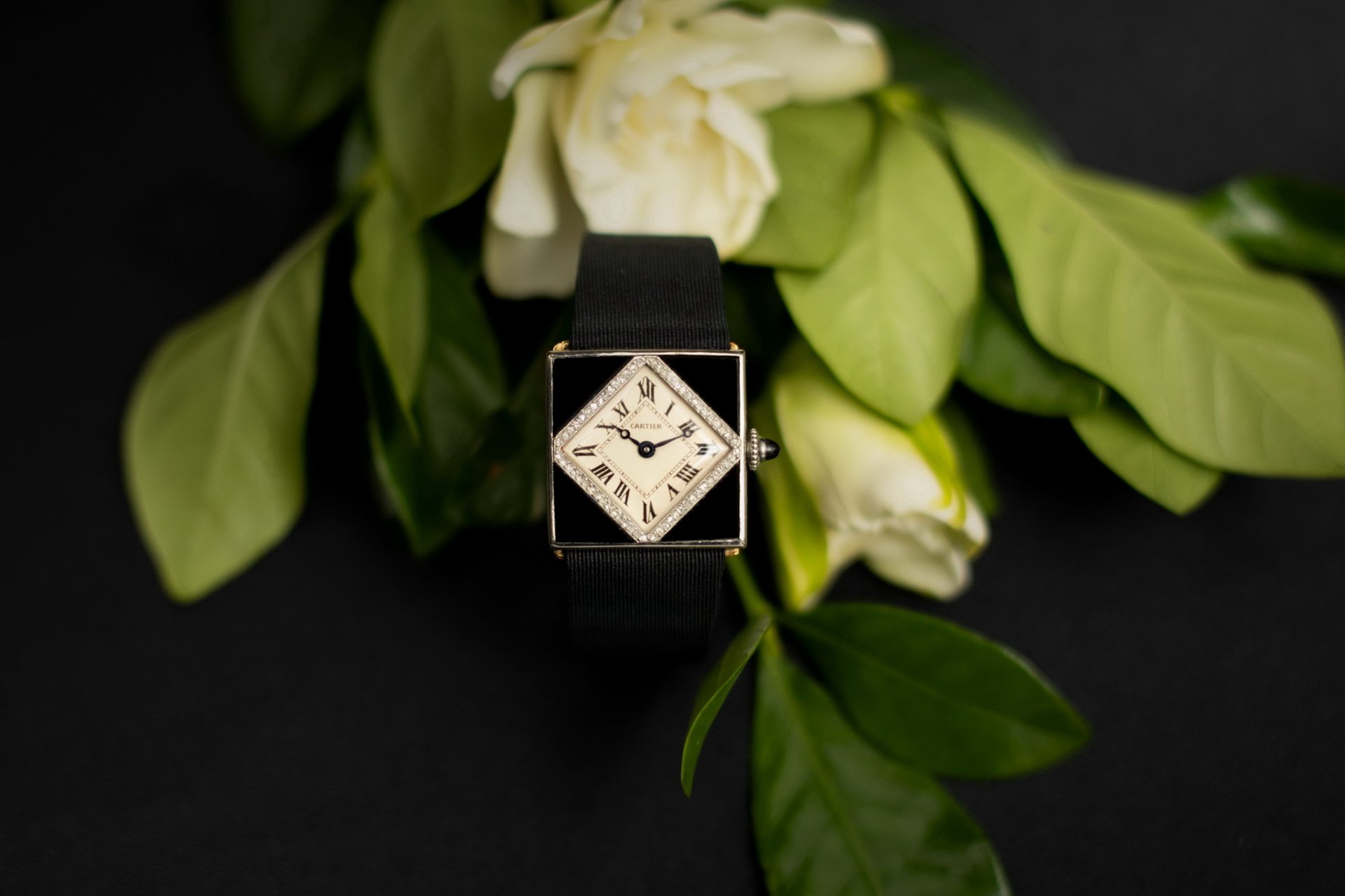 เริ่มต้นกันที่นาฬิกาวินเทจสำหรับผู้หญิง 1. Cartier Square Onyx and Diamond Lady’s Wristwatch - รุ่น “Nain Jaune” ซึ่งตั้งตามชื่อเกมกระดานของฝรั่งเศส โดยรุ่นที่นำมาจัดแสดงผลิตขึ้นในปี ค.ศ.1913-1914 (พ.ศ. 2456-2457) โดดเด่นด้วยหน้าปัดสีเงินล้อมเพชร ประมาณ 0.8 กะรัต ตัดกับมุมที่ประดับด้วยโอนิคส์ (Onyx)