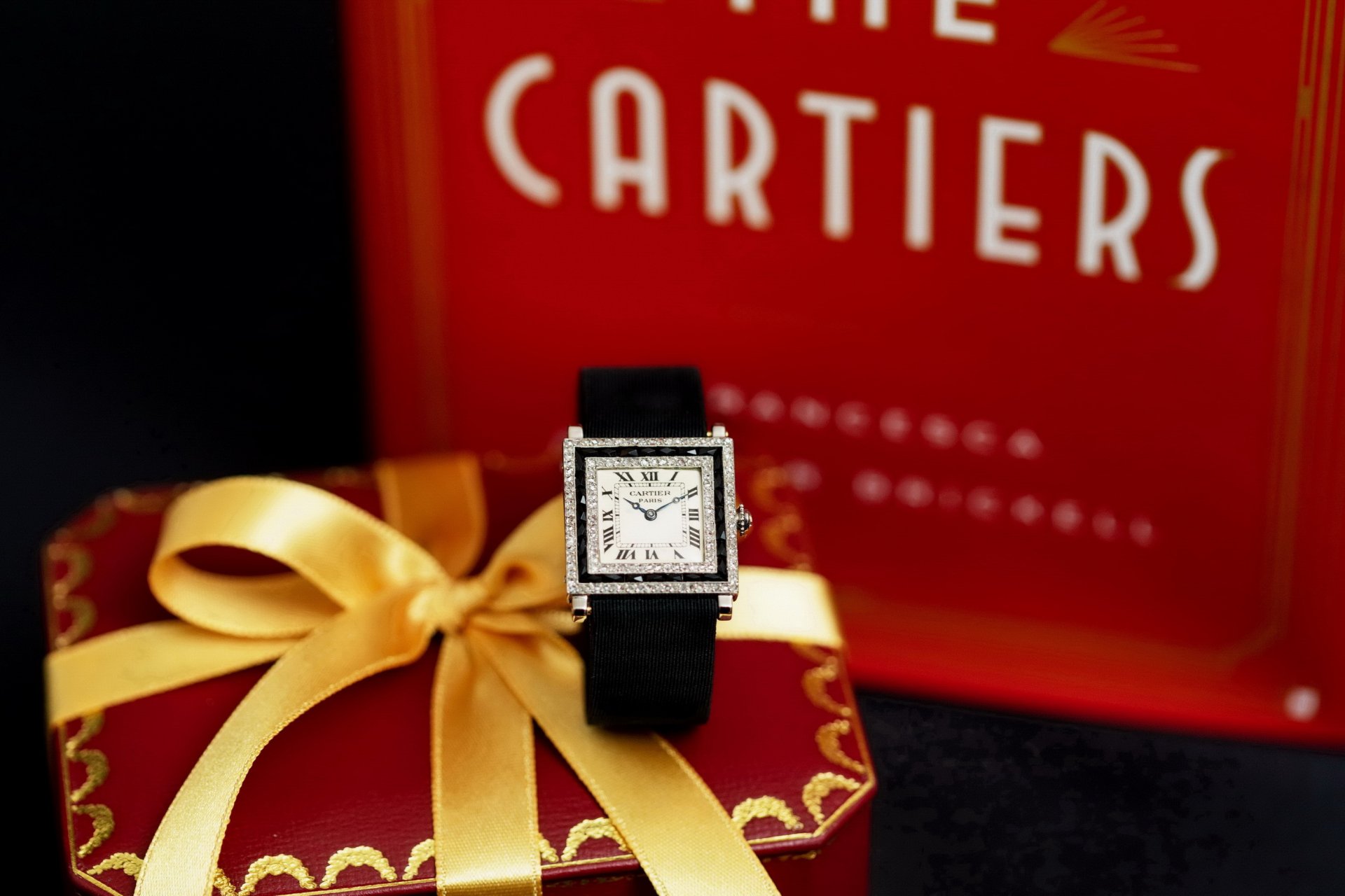 (พ.ศ. 2470) ตัวเรือนทองคำขาว หน้าปัดทรงสีเหลี่ยมล้อมเพชร ตัวเลขอารบิก และเข็มทรง Èpée หรือ ทรงดาบ และจุดแสดงเวลานาทีเป็นรูปรางรถไฟเพิ่มความโดดเด่นให้กับตัวเรือนด้วยสายนาฬิกาดีไซน์แบบสายเชือกสีดำใครที่หลงใหล Cartier Tank สุดยอดดีไซน์คลาสสิกจนกลายเป็นตำนานของคาร์เทียร์ต้องไม่พลาดยลโฉม