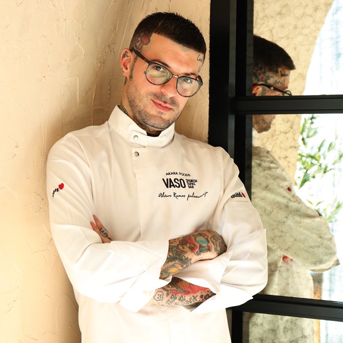 เราพูดคุยกับเชฟ Alvaro Ramos เชฟหนุ่มชาวสเปน ที่หลงใหลการทำอาหารตั้งแต่จำความได้ โดยได้รับการถ่ายทอดมาจากคุณยายและครูพักลักจำมาเรื่อยๆ นั้นทำให้เชฟ Ramos ชื่นชอบการทำได้แบบไม่ยาก ซึ่งตัวของเชฟก็ผ่านประสบการณ์การส่งความสุขด้วยอาหารมากมายจากต่างประเทศ ไม่ว่าจะจากที่จีน ที่เขาได้เรียนรู้วัฒนธรรมในแบบอาหารเอเชียผนึกรวมกับอาหารสเปนที่เป็นสูตรต้นตำรับจากคุณยาย จนกลายเป็นอาหารฟิวชั่นเอเชียผสมยุโรปเป็นสไตล์แบบ Contemporary Spanish Cuisine