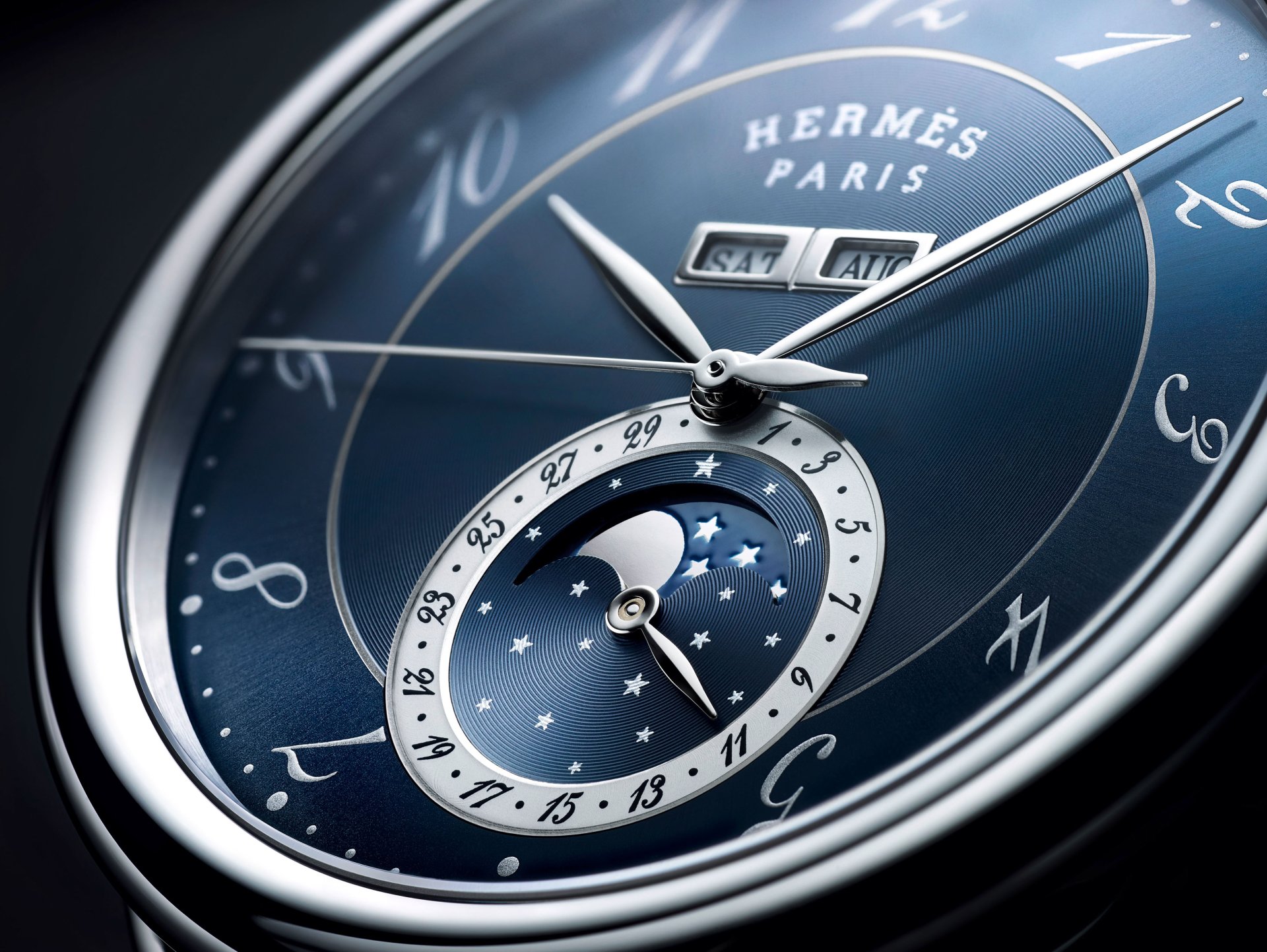 พื้นหน้าปัดสีน้ำเงินรัศมีของอาร์โซ กร็องด์ ลูน ใหม่ จับคู่กับสายหนังจระเข้สีน้ำเงิน Abyss ที่ล้ำลึก โทนสีเข้มขับเน้นความสง่างามแบบสบายๆ ของตัวเรือนสตีลและฝาหลังแซฟไฟร์ เข็มชั่วโมงที่เรียวยาวกวาดแสดงเวลาอย่างมีชีวิตชีวาผ่านตัวเลขที่ลาดเอียงซึ่งสร้างอิทธิพลอย่างน่าสนใจในขณะเคลื่อนไหว การแสดงผลแบบพลวัตนี้ได้รับการเสริมความโดดเด่นด้วยวงหน้าปัดย่อยแสดงเวลาข้างขึ้นข้ามแรมและวันที่ ซึ่งประดับด้วยท้องฟ้าที่เต็มไปด้วยดวงดาว เช่นเดียวกับช่องหน้าต่างคู่แสดงวันในสัปดาห์และเดือนที่ปรากฏใต้สัญลักษณ์แอร์เมส การแสดงเวลาชั่วโมง นาที วินาทีและระบบปฏิทินที่สมบูรณ์แบบจะแสดงค่าไปตามจังหวัดการทำงานของกลไกจักรกลอัตโนมัติที่บรรจุในตัวเรือน ซึ่งได้รับการรังสรรค์ขึ้นในเวิร์กช้อปการผลิตนาฬิกาของแอร์เมส เช่นเดียวกับหน้าปัดและสาย