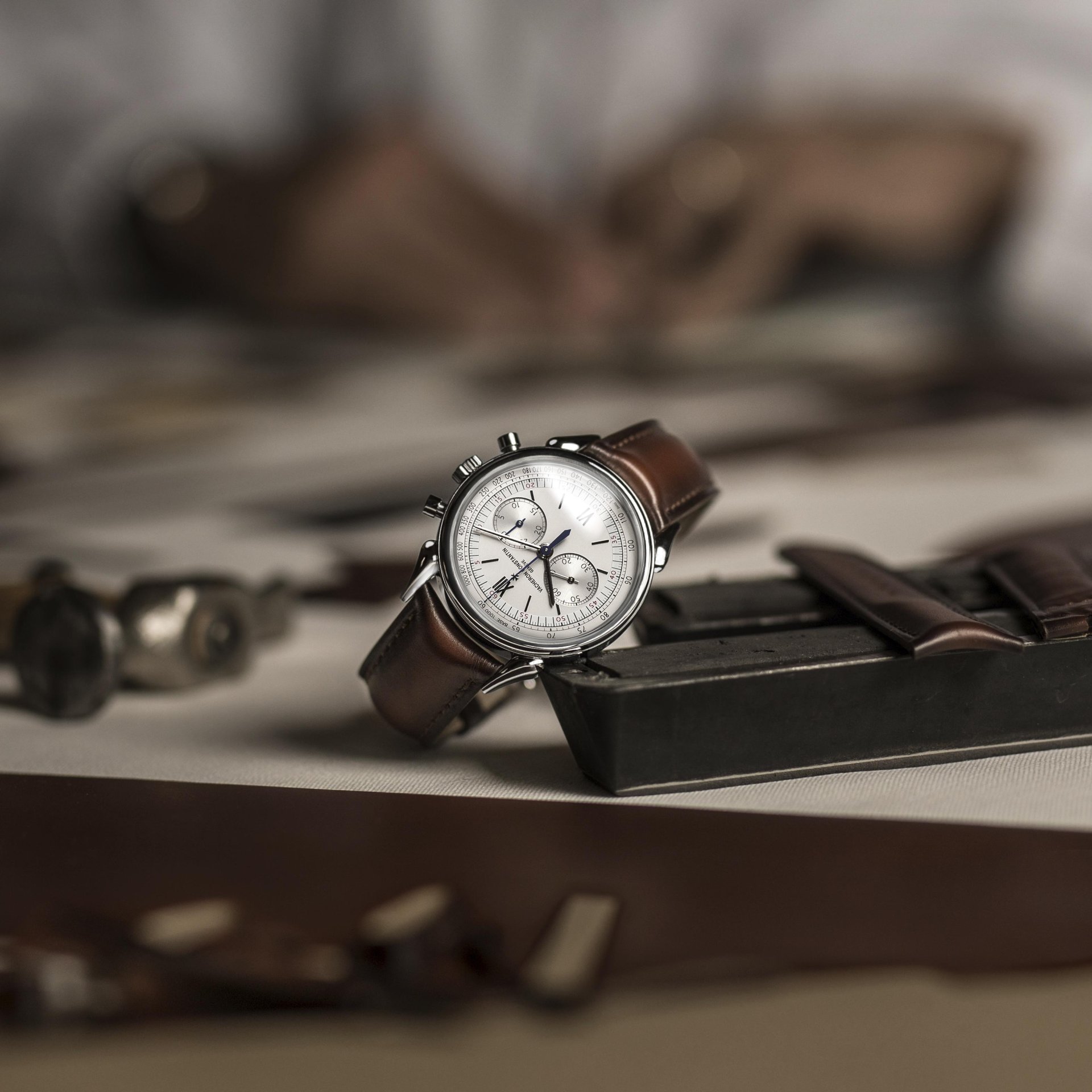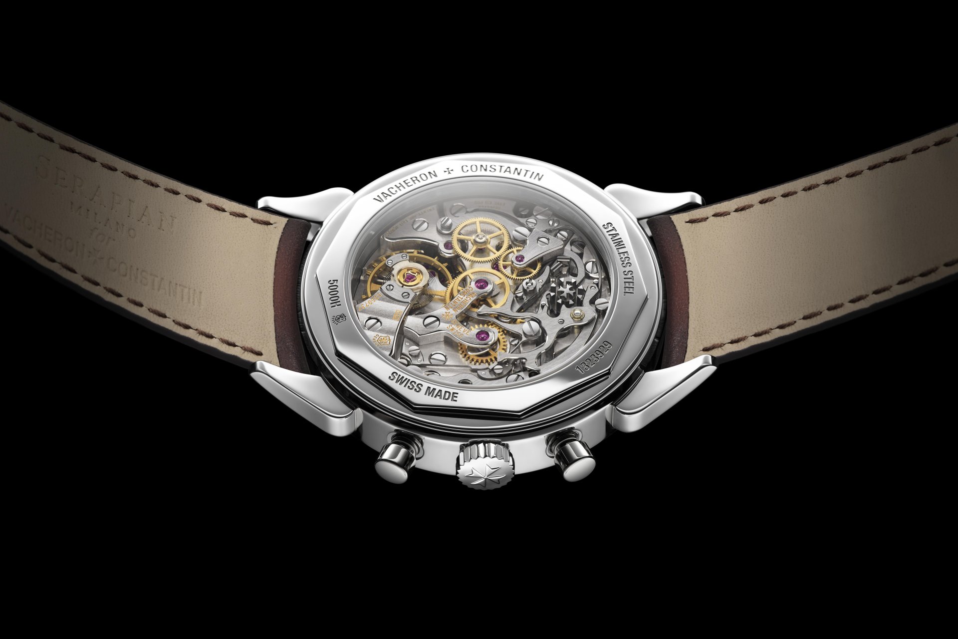 ในฐานะส่วนหนึ่งของคอลเลกชั่น Historiques แบรนด์ Vacheron Constantin ได้นำเสนอผลงานรุ่นไอคอน “Cornes de vache” นาฬิกาโครโนกราฟกันน้ำรุ่นแรกของเมซงที่เปิดตัวในปี 1955 และกลายเป็นที่จดจำในทันทีด้วยความโดดเด่นของดีไซน์ข้อต่อตัวเรือนที่เชื่อมกับสายในรูปทรงเขาวัว ปัจจุบันนาฬิการุ่นนี้กลายเป็นหนึ่งในนาฬิกาซึ่งเป็นที่ตามมาสูงสุดของเหล่านักสะสม ผลงานสร้างสรรค์ใหม่ซึ่งอุทิศความงามสง่าให้กับรุ่นดั้งเดิม หากนำมาตรฐานการผลิตนาฬิกาอันทันสมัยในยุคปัจจุบันมาประยุกต์ใช้ในการผลิต ขนาดเส้นผ่าศูนย์กลางตัวเรือนที่มาพร้อมความสามารถกันน้ำได้ 30 เมตรได้รับการขยายขนาดเพิ่มขึ้นเป็น 38.5 มิลลิเมตร มาพร้อมกลไกไขลานโครโนกราฟ คาลิเบอร์ 1142 ทำงานด้วยความถี่ 21,600 ครั้งต่อชั่วโมง และสำรองพลังงานได้นาน 48 ชั่วโมง กลไกชุดนี้ขับเคลื่อนทั้งฟังก์ชั่นแสดงเวลา การแสดงวินาทีบนหน้าปัดย่อย การจับเวลาในระบบโครโนกราฟด้วยเข็มวินาทีกลางและการแสดงผลการจับเวลานาทีบนหน้าปัดย่อยโอปอลสีเทากำมะหยี่ตกแต่งลายก้นหอยอย่างประณีต รอบขอบหน้าปัดประดับสเกลนาทีสีขาว ประกอบสายหนังวัวสีน้ำตาลเข้มแบบพาติน่าที่แบรนด์มอบความไว้วางใจให้กับผู้ผลิตเครื่องหนังชื่อดังจากมิลานอย่าง Maison Serapian (เมซง เซราเปียน) ที่ก่อตั้งมาตั้งแต่ปี 1928 โดยครั้งนี้นับเป็นความร่วมมือครั้งแรกระหว่างสองเมซง