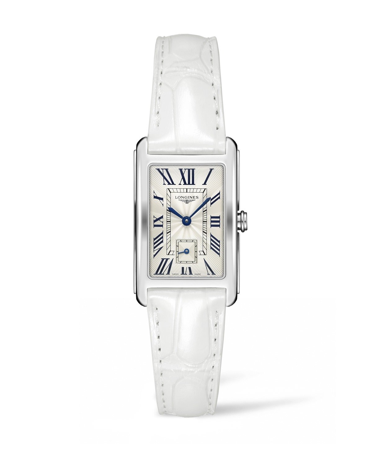Longines DolceVita (ลองจินส์ โดลเชวิต้า) มีความโดดเด่นที่ตัวเรือนทรงสี่เหลี่ยมผืนผ้าที่ได้แรงบันดาลใจจากนาฬิกาในยุค 1920 โดยเป็นการผสมผสานทรวดทรงเรขาคณิตเข้ากับเส้นสายที่อ่อนช้อย โมเดล L.5.512.4.71.2 ทำจากตัวเรือนสตีลขนาด 23.00 x 37.00 มม. หน้าปัดสีเงินแฟลงเก้ ตกแต่งเลขโรมันสี ทำงานด้วยกลไกควอทซ์ เข็มบอกชั่วโมงและนาทีทำจากสตีลชุบสีน้ำเงิน มาพร้อมสายรัดข้อมือหนังอัลลิเกเตอร์สีขาวที่มีอุปกรณ์การเปลี่ยนสายในตัว