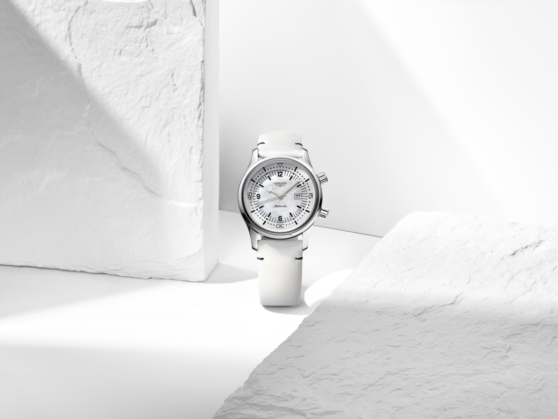 The Longines Legend Diver Watch (เดอะ ลองจินส์ เลเจนด์ ไดเวอร์ วอทช์) นาฬิการุ่นไอคอนิกแห่งตระกูล Heritage คอลเลกชั่นที่เปรียบเสมือนการน้อมรำลึกถึงจิตวิญญาณในอดีตของลองจินส์ ในฐานะแบรนด์นาฬิกาที่อยู่เคียงข้างเหล่านักบุกเบิกที่ออกหาญผจญไปในโลกกว้าง ไม่ว่าจะเป็นทางอากาศ ทางบก หรือใต้ท้องทะเล ภายในตัวเรือนขนาด 36 มม.ของโมเดล L3.374.4.80.0 บรรจุกลไกไขลานอัตโนมัติ มีหน้าปัดสีขาวมุก เข็มนาฬิกาสีเงินขัดเงา ตกแต่งเลขอารบิก และเสริมด้วยเครื่องหมายสามเหลี่ยมเคลือบสาร Super-LumiNova® เพื่อช่วยการมองเห็นใต้น้ำได้ดียิ่งขึ้น ซึ่งถือเป็นคุณสมบัติเด่นของนาฬิกาดำน้ำ และเพื่อรักษาเอกลักษณ์ของโมเดลต้นแบบไว้ ฝาหลังตัวเรือนจึงสลักสัญลักษณ์รูปนักดำน้ำ มาพร้อมสายรัดข้อมือหนังสีขาวบริสุทธิ์ เพื่อให้เข้ากับหน้าปัดที่มีความเรียบหรูอันเป็นเอกลักษณ์