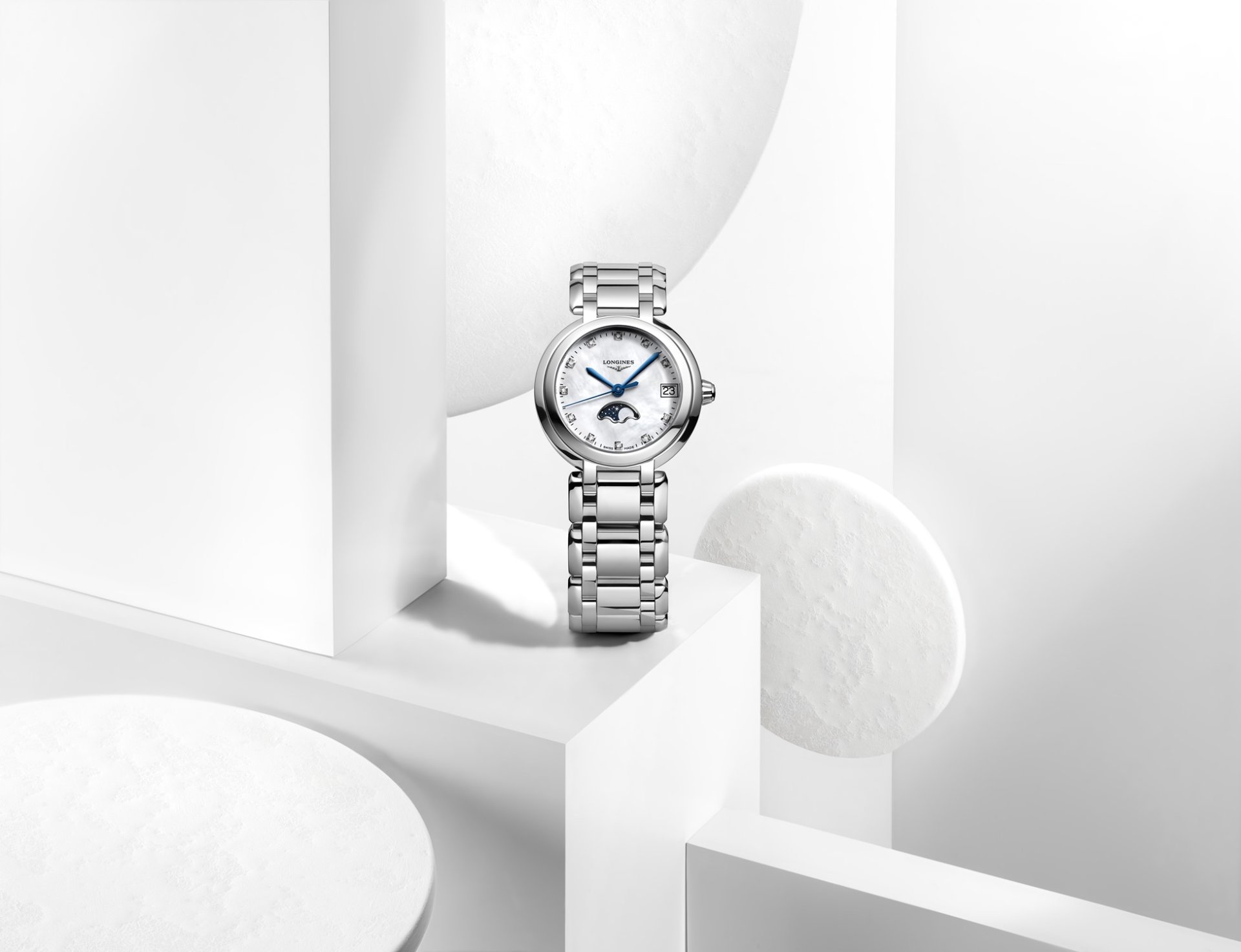 คอลเลกชั่น Longines PrimaLuna (ลองจินส์ พริมาลูนา) คือตัวแทนอันสมบูรณ์แบบของความสง่างามของผู้หญิงที่ได้แรงบันดาลใจจากความงามวิจิตรและน่าพิศวงของท้องฟ้า ไม่ว่าจะเป็นหน้าปัด ตัวเรือน และข้อต่อที่เชื่อมตัวเรือนกับสายรัดข้อมือ ต่างสะท้อนให้เห็นถึงความโค้งมนอันงดงามของดวงจันทร์ โมเดล L8.115.4.87.6 มาพร้อมตัวเรือนสแตนเลส สตีลขนาด 30.50 มม. ภายในบรรจุกลไกควอทซ์ มาพร้อมหน้าปัดมุกสีขาวมาเธอร์ออฟเพิร์ลตกแต่งอินเด็กซ์เพชร 12 เม็ดโดดเด่นด้วยฟังก์ชั่นแสดงข้างขึ้นข้างแรม (Moon phase) และสายรัดข้อมือสตีลที่รังสรรค์ขึ้นมาอย่างไร้ที่ติ