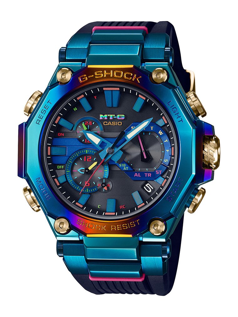 MTG-B2000PH นาฬิการุ่นลิมิเต็ดเอดิชั่นใหม่นี้เป็นส่วนหนึ่งของซีรีย์ MT-G โดดเด่นด้วยการผสานวัสดุโลหะและเรซิน ลวดลายการออกแบบได้รับแรงบันดาลใจจากนกฟีนิกซ์สีน้ำเงินในตำนานที่เชื่อว่าเป็นสัตว์แห่งความเป็นสิริมงคล กรอบและตัวเรือนเคลือบไอพีสีรุ้ง กรอบนาฬิกาเป็นชิ้นส่วนที่แยกออกจากตัวเรือนไล่เฉดสีเหลือง-แดงตามแนวขวางที่กรอบและตามแนวยาวที่ตัวเรือน นอกจากนี้มีการเคลือบไอพีสีฟ้าเหมือนการไล่เฉดสีของเปลวไฟที่ผสมผสานกันอยู่อย่างลงตัว สายนาฬิกาสีน้ำเงินกรมท่าโปร่งใสทำให้นาฬิกาโดดเด่นด้วยสีน้ำเงินอันเจิดจรัสของนกฟีนิกซ์