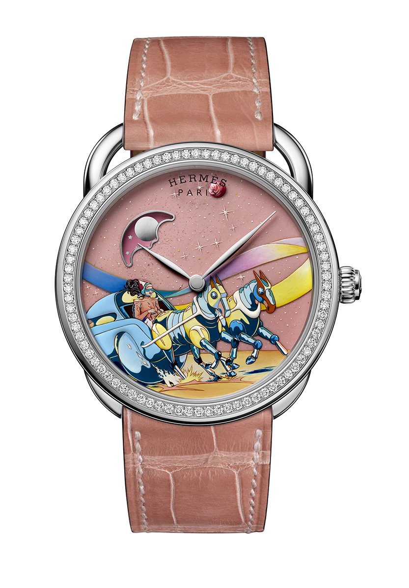 สองผลงานในซีรีส์ผลิตจากัดมาพร้อมการตีความใหม่ในงานออกแบบดั้งเดิมของผ้าพันคอไหม Space Derby เรือนแรกงดงามในตัวเรือนทองคาขาวและหน้าปัดอเวนเจอลีนที่เผยให้เห็นจ็อกกี้และรถม้าอากาศพลศาสตร์ของเขาที่ถูกดึงโดยม้าสายพันธุ์ดีในชุดเกราะทะยานไปใต้ท้องฟ้าที่เต็มไปด้วยดวงดาว ผลงานที่สองในตัวเรือนทองคาขาวประดับด้วยเพชรน้างาม มาพร้อมการแสดงเวลาพระจันทร์สีแดงเข้ม เช่นเดียวกับผมสีเพลิงของจ็อกกี้ที่ถือบังเหียนรถม้าพุ่งด้วยความเร็วเต็มพิกัด ทั้งสองรุ่นมาพร้อมกลไกอัตโนมัติที่ผลิตขึ้นภายในโรงงานของ แอร์เมส (Hermès) และจับคู่กับสายหนังจระเข้สีน้าเงินหรือสีโอลด์โรสเข้ากับสีบนหน้าปัด ทั้งหมดผลิตขึ้นภายในเวิร์กช้อปผลิตนาฬิกาชั้นสูงของแอร์เมส (Hermès Horloger) ด้วยทักษะที่ได้รับการปลูกฝังโดยเมซง