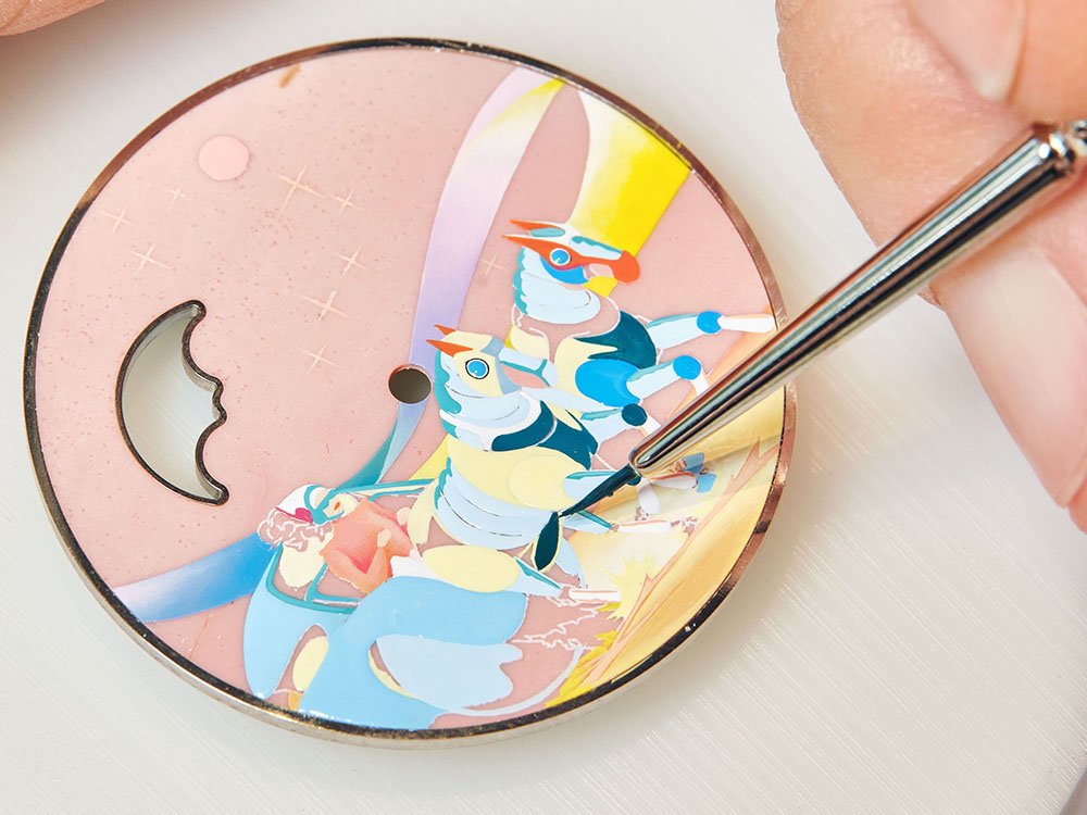 ภาพวาดจุลจิตรกรรมบนพื้นหน้าปัดอเวนเจอรีนหรือสีชมพูโอพาลิน ก่อให้เกิดมิติใหม่ของการสร้างสรรค์นาฬิกาอาร์โซ งานศิลปะที่ต้องการความใส่ใจสูงสุด การทางานที่แม่นยาและความรู้สึกในด้านสีสันที่ยอดเยี่ยม เพื่อจัดองค์ประกอบและมอบความมีชีวิตชีวาให้กับความแตกต่างแม้เพียงเล็กน้อย ความเข้มอ่อนของโทนสี และรายละเอียดที่เปี่ยมเอกลักษณ์ เฉดสีที่เร่าร้อนสร้างความมีชีวิตผ่านภาพวาดขนาดเล็กที่ใช้เทคนิคการวาดภาพระดับไมโครหลายชั้นอย่างพิถีพิถันและต่อเนื่องด้วยการใช้แปรงลงสีและทาให้แห้งในเตาเผาความร้อนสูง