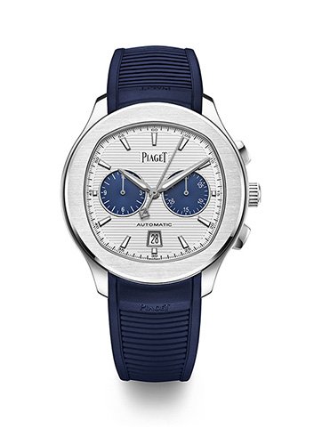 เพื่อให้สอดรับกับไลฟ์สไตล์ที่หลายหลากยิ่งขึ้น แบรนด์จึงหยิบสายรัดข้อมือยางแนวสปอร์ตมาผสานไว้ในโมเดลของ Piaget Polo Chronograph เป็นครั้งแรก โดย ref.G0A46013 นี้ ยังคงมาพร้อมฟังก์ชั่นจับเวลาโครโนกราฟและกลไกอินเฮ้าส์คาลิเบอร์ 1160P คุมโทนด้วยหน้าปัดสไตล์ Panda ที่ออกแบบให้วงหน้าปัดย่อยสีน้ำเงินตัดรับกับสีเงินของพื้นหน้าปัดหลักได้อย่างลงตัวเพิ่มวิสัยทัศน์แม้ในที่สว่างน้อยด้วยเข็มและอินเด็กซ์บอกเวลาเคลือบสารเรืองแสงซุปเปอร์ลูมิโนว่า
