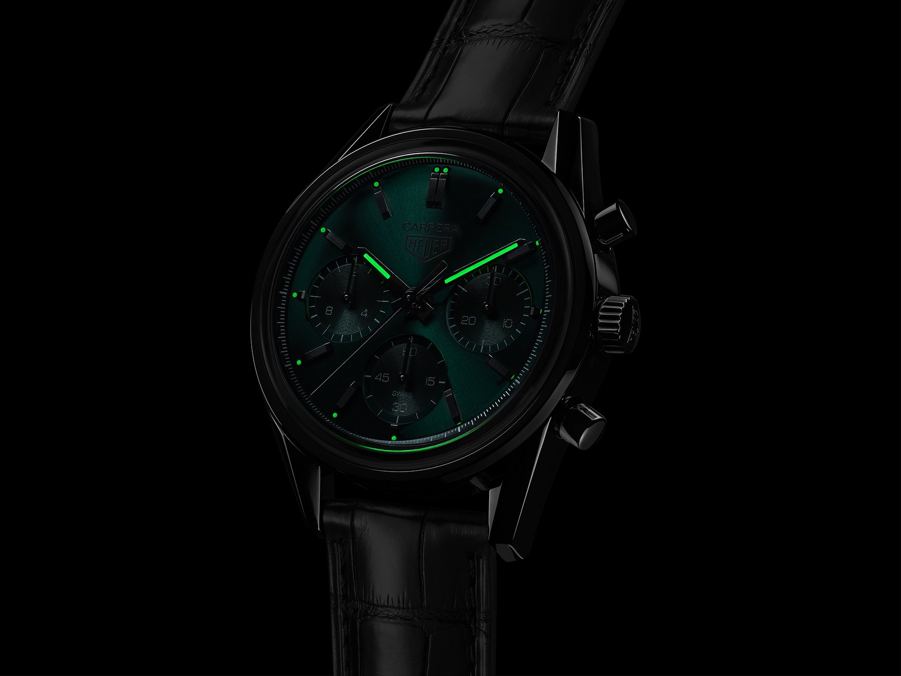 นาฬิกาจับเวลาโครโนกราฟ TAG Heuer Carrera Green Special Edition ยังคงเอกลักษณ์ของนาฬิกา Heuer Carrera ref. 2447 ทั้งขาตัวเรือนดีไซน์ตัวเรือนปุ่มกดที่ขัดแต่งสวยเนี้ยบและหน้าปัดที่โดดเด่นเช่นเดียวกับรุ่นก่อน แต่ก็มีรายละเอียดใหม่อื่นๆที่เพิ่มเข้ามา และขนาดตัวเรือนที่ขยายใหญ่ขึ้นจาก 36 มม. เป็น 39 มม. เพื่อให้รับกับสมัยนิยม หน้าปัดใช้โครงสร้างแบบ tricompax ดูเรียบหรูหน้าปัดย่อยตกแต่งด้วยลายเส้นหมุนวนเป็นก้นหอย หน้าปัดจับเวลา 30 นาทีอยู่ ณ ตำแหน่ง 3 นาฬิกา หน้าปัดจับเวลาชั่วโมง ณ ตำแหน่ง 9 นาฬิกา และแสดงวินาที่ ณ ตำแหน่ง 6 นาฬิกา ส่วนเข็มชั่วโมงและนาทีดีไซน์เป็นเหลี่ยมมุมสวยงามเคลือบสารเรืองแสง Super-LumiNova® เพื่อการอ่านค่าเวลาได้อย่างชัดเจนและส่วนกระจกแซฟไฟร์คริสตัล ‘ทรงกล่อง’ สไตล์เรโทรนั้นได้แรงบันดาลใจจากนาฬิกา Heuer Carrera รุ่นออริจินัลหน้าปัดประดับโลโก้ Heuer และชื่อ Carrera