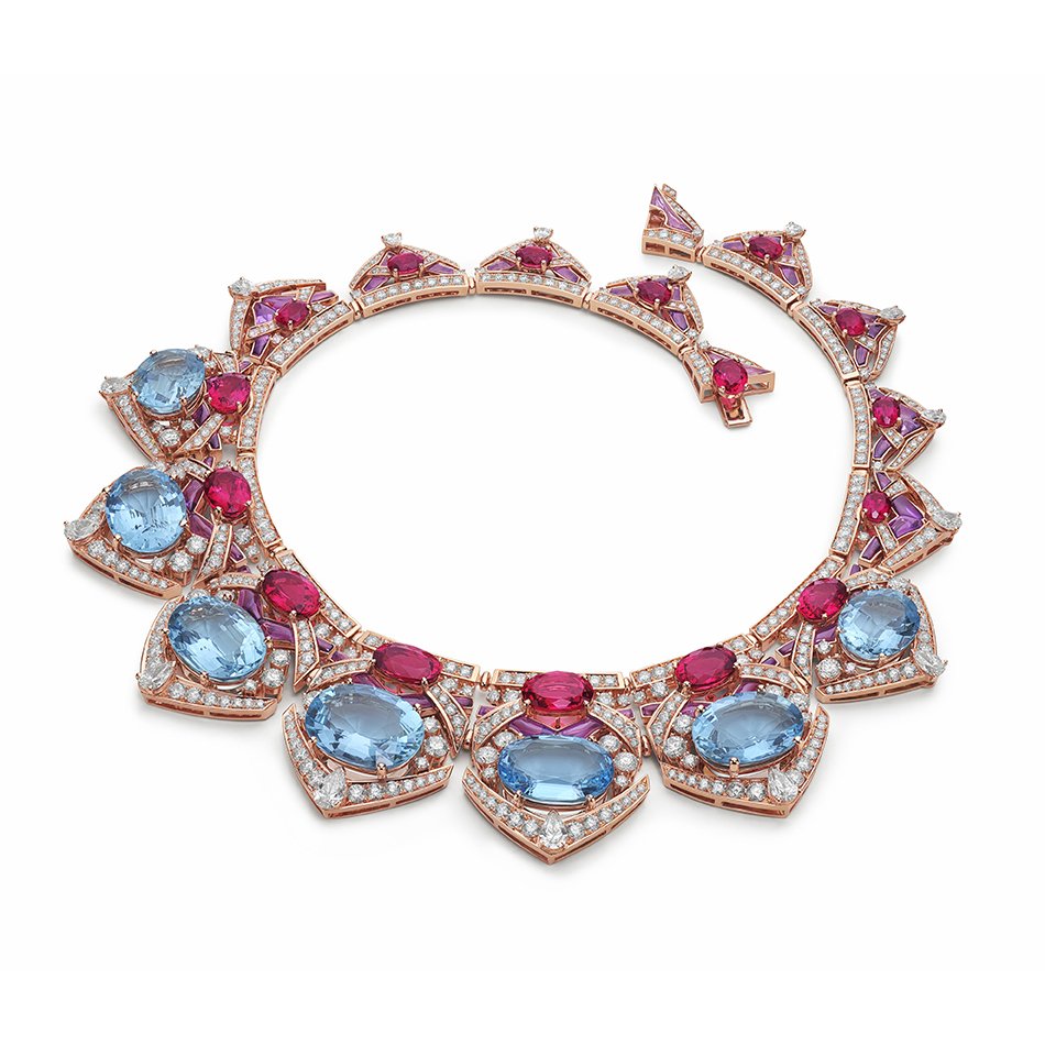 ความรื่นรมย์แห่งการเฉลิมฉลองของยุคเอชท์ตีส (Eighties) ได้หวนคืนมาอีกครั้ง แม้จะอยู่ภายใต้การกลั่นกรองแห่งความร่วมสมัย ในสร้อยคอ คัลเลอร์ เลกาซี (Color Legacy) ที่แสดงออกถึงการประพันธ์ดนตรีด้วยจังหวะแห่งท่วงทำนองอันน่าประทับใจของบรรดาอัญมณีสีสันแตกต่างกัน ถ่ายทอดเป็นลำแสงอันแวววาวเจิดจรัสแห่งการตัดเจียระไนและการประดับตกแต่งอันแสนประณีตวิจิตร ประกอบด้วยอควอมารีนทรงรีเจ็ดเม็ด น้ำหนักรวมเกือบ 84 กะรัต ที่จับคู่เข้ากับรูเบลไลต์ทรงรี 16 เม็ด, อเมทิสต์พัฟฟ์ท็อป (buff-top) 32 เม็ด ตัดเจียระไนอย่างพิถีพิถันในอิตาลีเพื่อให้รับไปกับโครงร่างของสร้อยคอ เช่นเดียวกับเพชรทรงลูกแพร์ 15 เม็ด พร้อมทั้งเพชรบริลเลียนต์คัตและเพชรประดับพาเว่ ซึ่งให้ผลลัพธ์เป็นการแสดงออกอย่างโดดเด่นและสมบูรณ์แบบแห่งจิตวิญญาณอันเปี่ยมด้วยความสนุกสนานร่าเริงจากภาพแห่งอัญมณีอันละลานตาของ Bvlgari
