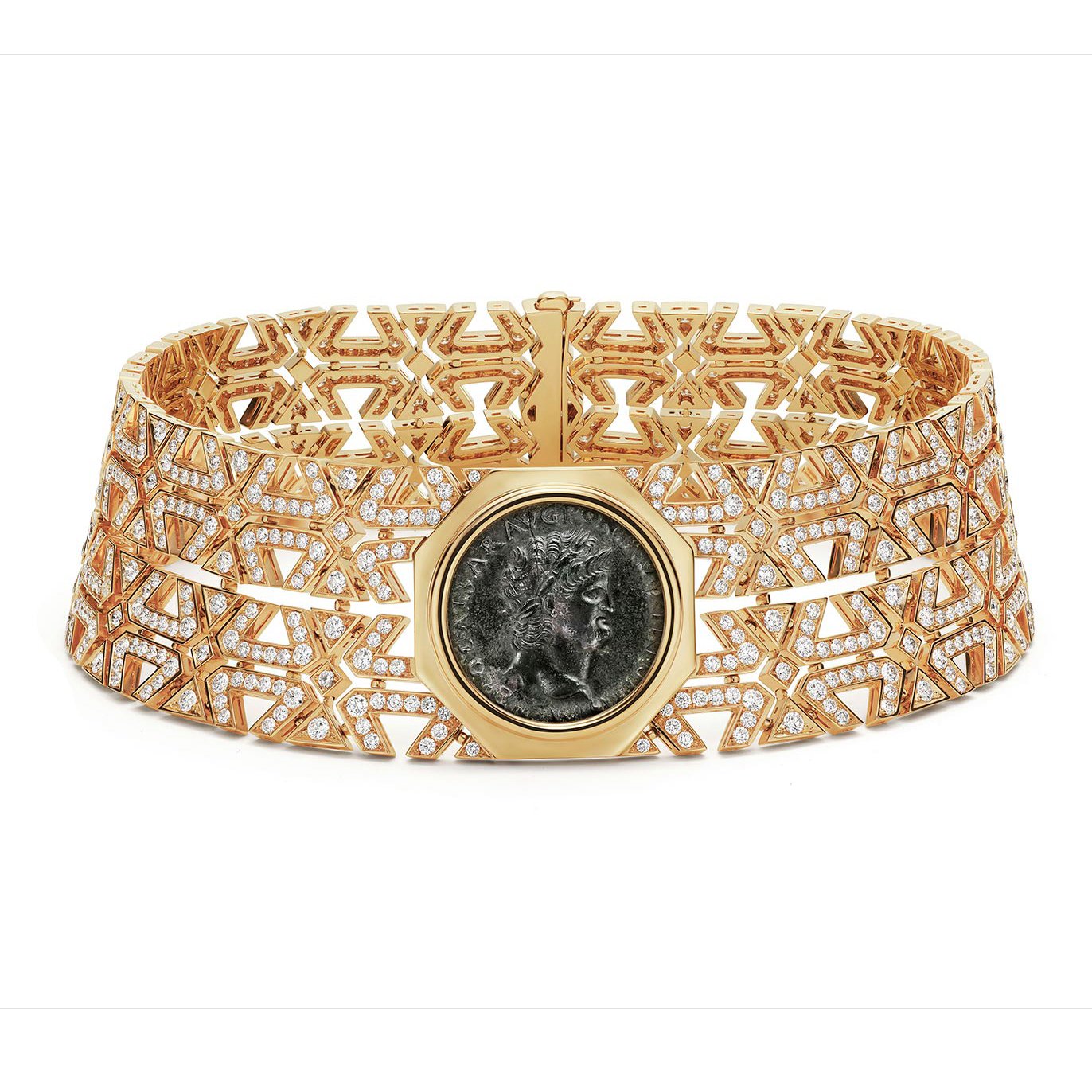 ชิ้นงานเครื่องประดับอัญมณีชั้นสูง โมเนต์ (Monete) อันเป็นไอคอนิกของ Bvlgari ได้ค้นพบซึ่งการตีความใหม่อันทันสมัยและซับซ้อนด้วย โมเนต์ วีฟ (Monete Weave) จากเหรียญบรอนซ์เก่าแก่ที่ถูกเก็บรักษาไว้อย่างดีที่ปรากฏด้วยภาพอันห้าวหาญของจักรพรรดิแนโรแห่งโรมัน (Roman emperor Nero) ประดับอยู่ภายในขอบทรงแปดเหลี่ยม ซึ่งเป็นจุดดึงดูดใจสำคัญของโชคเกอร์อันน่าทึ่งชิ้นนี้ โดยรังสรรค์ขึ้นจากทองประดับคลุมด้วยเพชร และงานออกแบบอันอ่อนนุ่มและสวมใส่สบาย ซึ่งจำเป็นต้องใช้เวลาถึง 1,400 ชั่วโมงของการทำงานด้วยมือ เผยให้เห็นภาพแห่งสถาปัตยกรรมเชิงกราฟิกที่ได้รับแรงบันดาลใจมาจากปริมาตรและมิติที่ออกแบบขึ้นโดย ซาฮา ฮาดิด (Zaha Hadid) กับหลากหลายพรมแดนระหว่างความเก่าแก่โบราณและความทันสมัย ซึ่งหล่อหลอมอยู่ภายใน ผลงานอันแสนวิเศษแห่งอัจฉริยภาพและงานฝีมือชั้นยอด