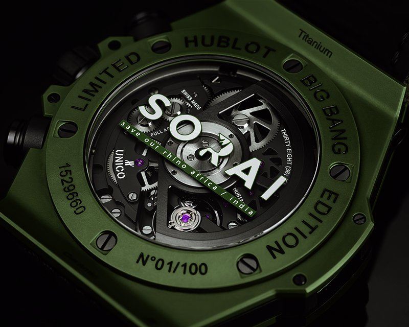 โดยอูโบลท์ (Hublot) ได้ใช้ประโยชน์จากการเข้าถึงผู้คนในระดับสากลได้อย่างกว้างขวาง และยืนยันอีกครั้งถึงการสนับสนุนอย่างแข็งขันต่อ เควิน ปีเตอร์เซน (Kevin Pietersen) และโซไร (SORAI - Save Our Rhino Africa India) ด้วยการเปิดตัวนาฬิการุ่นใหม่ บิ๊ก แบง ยูนิโค โซไร (Big Bang Unico SORAI) เพื่อเชื้อเชิญให้เจ้าของในอนาคตของนาฬิการุ่นนี้ทั้ง 100 ท่านได้ช่วยกันสนับสนุนการพิทักษ์สัตว์ป่าเพื่อโลกของเรา โดยส่วนหนึ่งของรายได้จากการจำหน่ายนาฬิกาจะนำไปบริจาคโดยเฉพาะให้กับ แคร์ ฟอร์ ไวลด์ (Care for Wild) ศูนย์อนุรักษ์แรดใหญ่ที่สุดในโลกซึ่งได้รับการสนับสนุนจากโซไร เพื่อนำไปใช้ในกิจกรรมที่เป็นประโยชน์ต่อไป