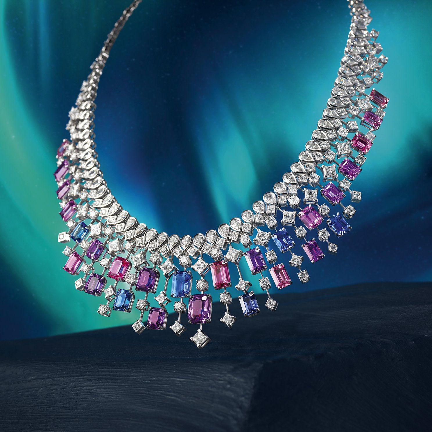 แท้จริงแล้วแสงของออโรร่าไม่ได้มีแต่สีเขียวแต่ความมหัศจรรย์นี้ยั งสามารถเปล่งแสงออกมาเป็นสีลูกกวาด อย่าง ชมพู ม่วง และน้ำเงิน ได้อีกด้วย และนี่คืออีกมุมมองที่เมซงเลื อกมาเป็นกรอบในการสร้างสรรค์ เครื่องประดับในเซ็ตนี้ แม้อัญมณีตระกูลแซฟไฟร์ จะครอบคลุมเกือบทุกเฉดสี แต่ถึงอย่างนั้นแซฟไฟร์ที่ นำมาประดับบนสร้อยจิวเวลรี่ชุด Gloaming Illuminations ทั้ง 27 เม็ด กลับใช้เวลามากกว่า 2 ปี ในการตามหา เพื่อให้ได้ทั้งขนาดเฉดสี และคุณภาพตามที่เมซงต้องการ หนึ่งในนั้นคือ แซฟไฟร์พัดพารัดชา 3 เม็ด ในเฉดสีชมพูอมส้ม ที่จัดเป็นแรร์ไอเท็มขนานแท้ในธรรมชาติ ขณะที่ตุ้มหูมาในดีไซน์ระย้าประดับแซฟไฟร์ 14 เม็ด และแหวนเข้าคู่ประดับแซฟไฟร์สีชมพู น้ำหนัก 6.53 กะรัต