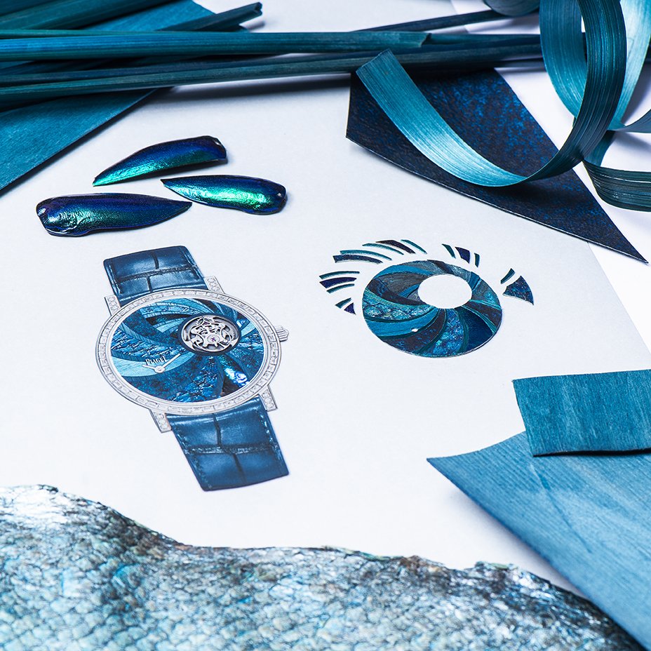 เรือนเวลาที่จำลองความน่าหลงใหลของผืนฟ้ายามค่ำคืน อีกความทรงจำอันแสนประทับใจร่วมกันของเหล่าเพียเจต์ โซไซตี้ นำเสนอผ่านเทคนิคมาร์เก็ตทรีอั นไร้ที่ติของศิลปินชื่อดัง โรส ซูนีเยร์ (Rose Saunier) นาฬิกา Celestial Dance ผลิตจำกัดเพียง 8 เรือนเท่านั้น แต่ละเรือนใช้เวลาในการร้อยเรียงมากกว่า 50 ชั่วโมง โดยศิลปินเลือกใช้วัสดุที่น่าเหลือเชื่ออย่างฟางข้าวย้อมเฉดสีน้ำเงิน, หนังลูกวัว, กระดาษพาร์ชเมนต์, ปีกแข็งของแมลง และ ไม้ฮอร์นบีม มาสร้างสรรค์บนพื้นหน้าปัด โดยตัดแต่งให้เป็นชิ้นขนาดจิ๋วจำนวนมาก ก่อนประกอบเข้าด้วยกันอย่างวิจิตรบรรจงตามแพทเทิร์นที่ ออกแบบไว้โอบล้อมขอบตัวเรือนด้วยเพชรทรงบาแก็ตต์และเพชรบริลเลียนต์คัต มาพร้อมดีไซน์หน้าปัดแบบเยื้องศูนย์กลางและขับเคลื่อนด้วยกลไกไขลานด้วยมือแบบบางพิเศษ 670P พร้อมจักรกลตูร์บิญอง