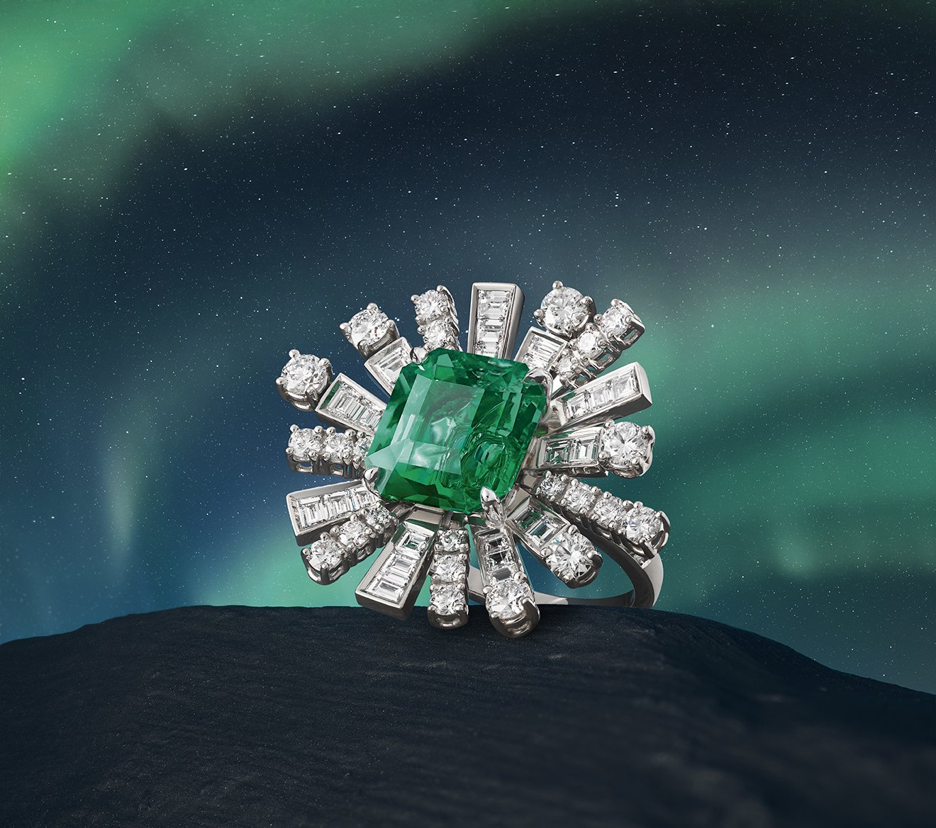 The Magical Aurora Set ราวกับหยิบเอาปรากฏการณ์แสงเหนือมาใส่ไว้ในเซ็ตนี้ อัญมณีที่นำมาบอกเล่าจึงเป็น 2 สีหลัก อย่าง สีเขียว และ สีขาว เริ่มจากสร้อย โดยไฮไลต์อยู่ที่อัญมณีเม็ดใหญ่ สุดอย่าง มรกตโคลัมเบีย น้ำหนัก 16.84 กะรัต ถูกนำมาจัดเรียงอย่างโดดเด่นกลางตัวเรือน ซึ่งอัญมณีสีเขียวชนิดนี้ขึ้นชื่อว่าหายากมากตามธรรมชาติ ดังนั้นแหล่งขุดจึงเป็นเหมือนกุญแจสำคัญเพื่อให้นักอัญมณีศาสตร์เข้าถึงมรกตที่ดีที่สุด หนึ่งในนั้นคือโคลัมเบีย ประเทศที่เป็นผู้ส่งออกมรกตส่วนใหญ่ของโลก ทั้งยังขึ้นชื่อเรื่องประกายสีเขียวที่สดใส แต่ถึงอย่างนั้นทักษะอันเชี่ยวชาญกว่า 15 ปีของช่างเจียระไนและช่างฝีมือของเมซงก็มีความสำคัญไม่น้อย เนื่องจากธรรมชาติของมรกตมีรอยแตกร้าวมาก หากไม่ระมัดระวังเป็นพิเศษอาจทำให้ต้องเริ่มสร้างชิ้นงานใหม่ทั้งหมด และเพื่อส่งมอบความงดงามของมรกตให้เด่นชัดที่สุด การเจียระไนแบบ square cut คือคำตอบขณะที่ประกายงามของมรกตที่ประดับบนแหวนและตุ้มหูก็พิเศษต่างกันไปตามแหล่งที่มา และถึงแม้จะใช้เวลาในการตามหามรกตเซ็ตนี้นานหลายปี แต่คุณภาพที่ได้กลับเข้ากันอย่างกลมกลืน ถ่ายทอดม่านแสงที่พลิ้วไหวของออโรร่าได้อย่างสมบูรณ์ แบบ