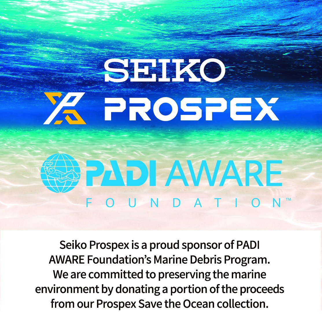 ไซโก วอตช์ คอร์ปอเรชั่น (Seiko Watch Corporation) มีความภูมิใจในการประกาศความร่วมมือครั้งใหม่กับ PADI® และมูลนิธิ PADI AWARE Foundation ในโครงการ Marine Debris Program เพื่อกำจัดขยะทะเล (marine debris*) โดย Seiko พร้อมรับมือความท้าทายนี้ด้วยการบริจาครายได้ส่วนหนึ่งจากการจำหน่ายนาฬิกาในคอลเลกชั่น Seiko Prospex Save the Ocean (ไซโก พรอสเป็กซ์ เซฟ ดิ โอเชียน) เพื่อมอบให้กับกลุ่มนักดำน้ำที่กำลังทำหน้าที่กำจัดและรายงานสถานการณ์ขยะที่อยู่ใต้ท้องทะเล ประวัตินาฬิกาดำน้ำของ Seiko เริ่มต้นขึ้นในปี 1965 ด้วยนาฬิกาดำน้ำเรือนแรกของญี่ปุ่น นับตั้งแต่นั้นมา นาฬิกาดำน้ำของ Seiko ได้พัฒนาขึ้นเพื่อตอบสนองความต้องการของนักดำน้ำมืออาชีพ โดยได้เปิดตัวนาฬิการุ่นสำคัญๆ ที่มาพร้อมความก้าวหน้าอย่างแท้จริง ทั้งในด้านความปลอดภัย ความน่าเชื่อถือ ความชัดเจน และความสะดวกในการใช้งาน จนถึงตอนนี้ Seiko มีความภูมิใจอย่างยิ่งในการรักษามาตรฐานระดับโลกสำหรับนาฬิกาดำน้ำ การยึดมั่นและรักษาประเพณี รวมถึงการสร้างสรรค์นวัตกรรมที่โดดเด่นตลอดระยะเวลา 5 ทศวรรษผ่านทางคอลเลคชันพรอสเป็กซ์ (Prospex)