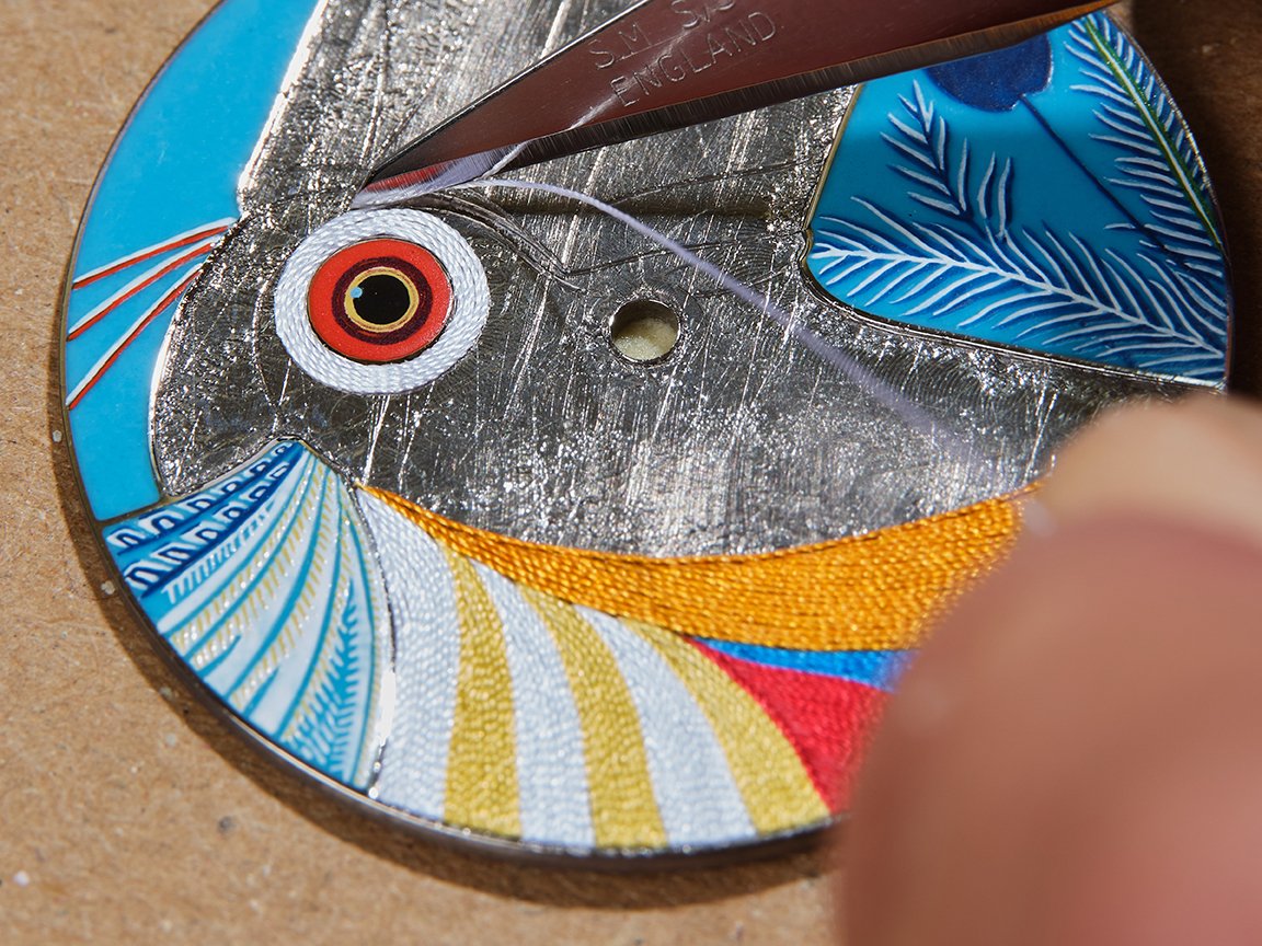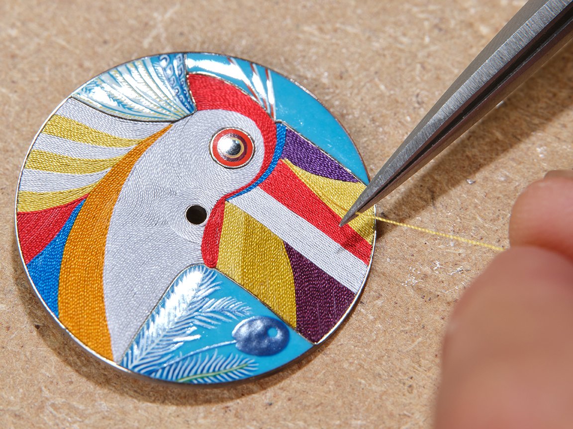 เคลือบครั้งแรกบนฐานทองไวท์โกลด์ ช่างฝีมือใช้แปรงที่มีความละเอียดมาระบายด้วยผงแก้วที่ผสมกับน้ำมันธรรมชาติ จากนั้นก็จะทาทับ ตากให้แห้งและเผาในเตาเผาอีกหลายชั้น ส่วนที่เป็นเส้นไหมจะถูกแกะสลักไว้รอบพื้นผิวที่เคลือบสีลงยา ด้ายแต่ละเส้นได้รับการจัดวางอย่างพิถีพิถันและบรรจงวางให้เข้าที่ด้วยความเอาใจใส่อย่างที่สุด เพื่อสร้างแสงที่จะส่องประกายและคงไว้ซึ่งการทอที่สมบูรณ์แบบ