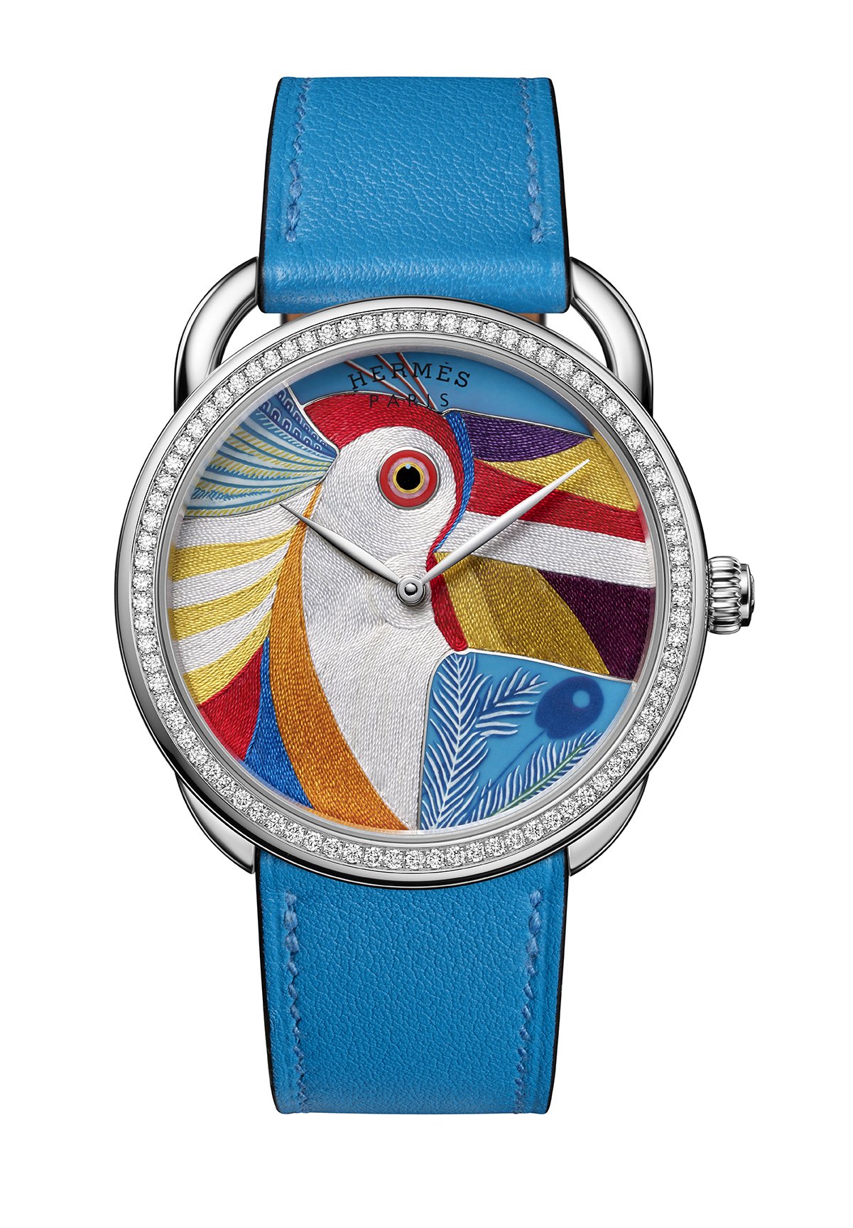 หน้าปัดที่เชื่อมโยงสองงานฝีมือที่ต้องอาศัยความชำนาญสูงและความโดดเด่นที่ใช้เวลานานห้าปีเพื่อที่จะทำให้สมบูรณ์แบบ เส้นไหมหลากสีที่เน้นด้วยความเข้มของงานจุลจิตรกรรมเคลือบสีลงยาขนาดเล็ก เส้นไหมของแอร์เมสที่เปี่ยมเอกลักษณ์และผลิตจากเทคนิคพิเศษเฉพาะของแบรนด์ ได้แรงบันดาลใจมาจากเวิร์คช็อปการทอชุดกิโมโนในญี่ปุ่น นกแห่งอเมซอนที่ถูกดีไซน์ให้มีชีวิตชีวา ถักทอขึ้นด้วยเส้นด้ายจำนวน 500 เส้นที่ประกอบขึ้นเป็นชิ้นๆ และดูมีชีวิตขึ้นมาด้วยฝีมือช่างอันวิจิตรบรรจงตลอดทั้งสัปดาห์