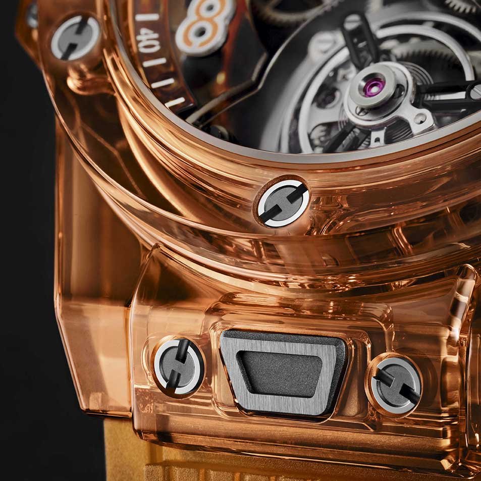 Hublot Big Bang Tourbillon Automatic Orange Sapphire ในตัวเรือนแซฟไฟร์สีส้มขนาด 45.0 มิลลิเมตร ที่ยึดแน่นด้วยสกรูรูปตัว H จำนวน 6 ตัวบนขอบตัวเรือนบ่งบอกถึงดีไซน์เอกลักษณ์ของ Hublot เพื่อให้เป็นสีส้มสดใสและโดดเด่น Hublot เลือกสายยางสีส้มใสที่มาพร้อมลายแถบนูน เปลี่ยนสายด้วยระบบอัจฉริยะ One-click ที่ได้รับการจดสิทธิบัตร และตัวล็อกสายไทเทเนียม ความพิเศษนี้ผลิตจำกัดเพียง 50 เรือนเท่านั้น