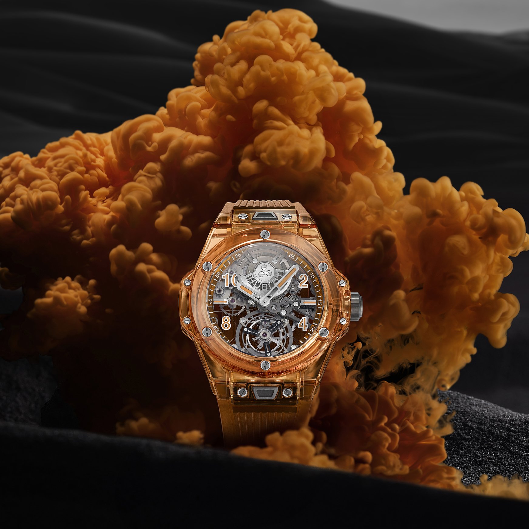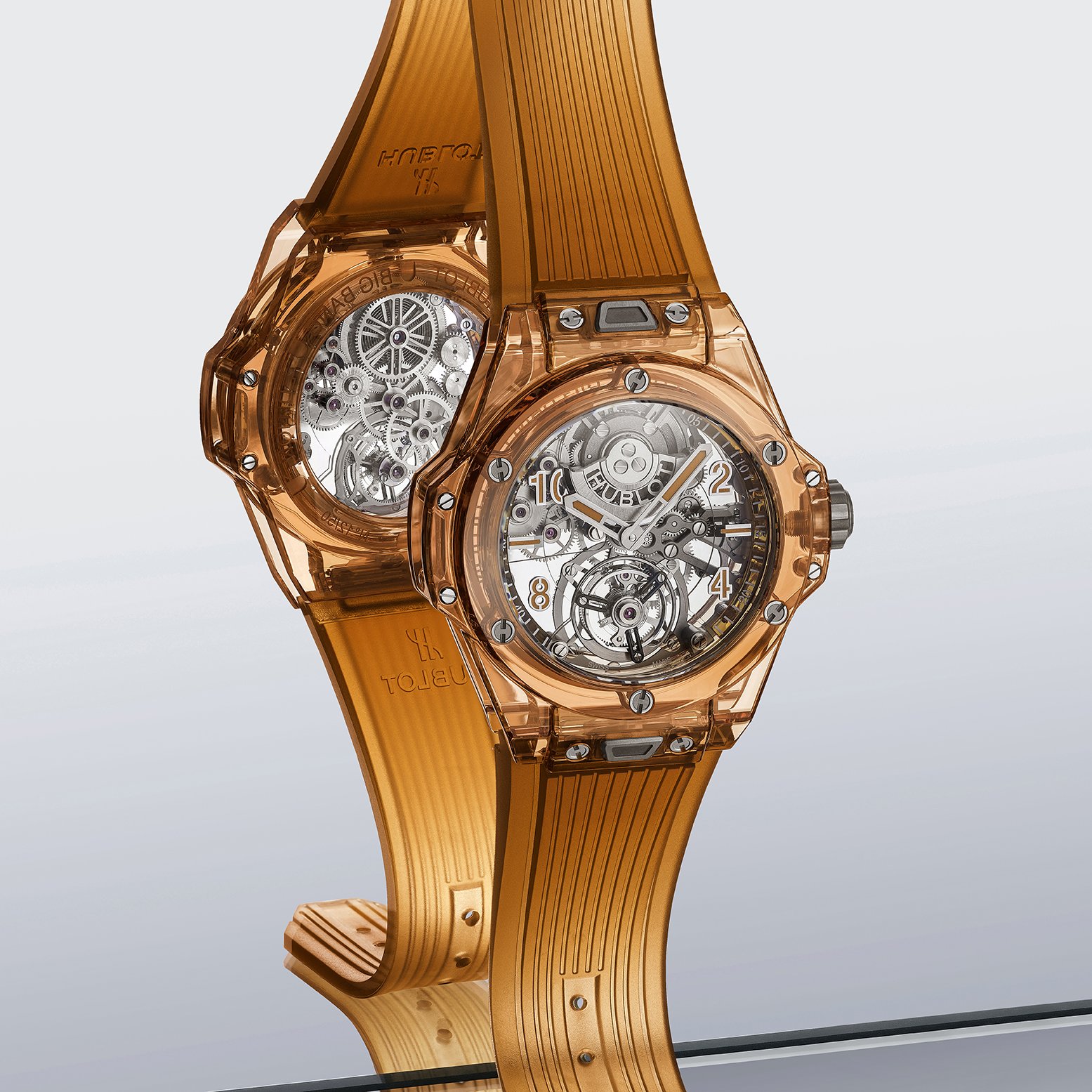 นาฬิการุ่นแรกของตระกูลแซฟไฟร์และเป็นเรือนแรกของโลกกับตัวเรือนแซฟไฟร์สีส้มโปร่งใส ความท้าทายอีกขั้นกับสีที่เกิดจากการผสมของสองแม่สีคือเหลืองและแดง ด้วยความสามารถทางเทคนิคอันยอดเยี่ยมก่อเกิดเป็นความงามที่ไม่เคยมีมาก่อน บวกกับความซับซ้อนของกลไกทูร์บิญองที่ได้รับการพัฒนาใหม่ทั้งหมด โดยติดตั้งกับกลไกอัตโนมัติ MHUB6035 แตกต่างจากกลไกดั้งเดิมที่มักจับคู่ทูร์บิญองกับกลไกไขลาน มาพร้อมความสามารถสำรองพลังงานได้นาน 72 ชั่วโมง ทำงานด้วยความถี่ 3 เฮิรตซ์ ระบบขึ้นลานมาพร้อมตลับลูกปืนเซรามิกและความก้าวหน้าทางเทคนิคล่าสุดของ Hublot และตอกย้ำความเป็นผู้นำด้วยการแสวงหาความโปร่งใสต่อเนื่องด้วยการใช้แซฟไฟร์ในการผลิตบางชิ้นส่วนของกลไก ทั้งสะพานจักรสามชิ้น สะพานยึดตลับลาน แป้นยึดทูร์บิญอง (tourbillon barrette) รวมถึงการใช้ไมโคร-โรเตอร์ในการขึ้นลาน ซึ่งมองเห็นได้ทั้งจากหน้าปัดและด้านข้างตัวเรือน โครงสร้างที่เป็นนวัตกรรมใหม่นี้ ไม่เพียงแสดงถึงความท้าทายด้านเทคนิคสำหรับนักออกแบบเท่านั้น แต่ยังสร้างชีวิตใหม่ในด้านสุนทรียศาสตร์ที่เสริมโครงสร้างอันตระการตาให้กับหน้าปัดในดีไซน์ร่วมสมัย ด้วยไมโคร-โรเตอร์ในตำแหน่ง 12 นาฬิกา ทำด้วยทอง 22k เคลือบเทาซึ่งได้รับการตกแต่งอย่างวิจิตรทั้งขัดแต่ง พ่นทรายและลายฉลุ สะท้อนการทำงานที่สัมพันธ์กับการหมุนของกรงทูร์บิญองเพื่อชดเชยค่าผิดเพี้ยนจากแรงโน้มถ่วงของโลกที่ตำแหน่ง 6 นาฬิกา ความพิสุทธิ์โปร่งใสชัดเจนยังเพิ่มสมรรถนะการอ่านค่าด้วยการเคลือบสารเรืองแสงบนหลักชั่วโมงและชุดเข็ม แม้แสงน้อยก็ไม่เป็นปัญหาในการอ่านเวลา