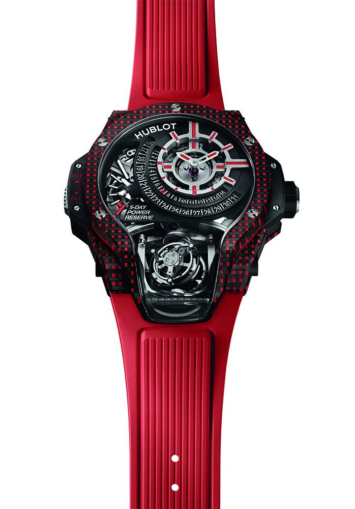 นาฬิกา HUBLOT MP-09 Tourbillon Bi-Axis ใหม่ทำงานด้วยจังหวะอันเปี่ยมด้วยพลังของกลไกจักรกลไขลานด้วยมือ คาลิเบอร์ HUB9009.H1.RA การสำรองพลังงานได้ 5 วัน และติดตั้งด้วยทูร์บิญองสองแกน โดยการหมุนหนึ่งรอบเต็มทุกๆ นาทีสำหรับแกนแรก และการหมุนที่สองในทุกๆ 30 วินาทีสำหรับแกนที่สอง การหมุนราวดั่งสะกดจิตด้วยสองรอบคู่นี้เองได้นำมาสู่แนวคิดของการสร้างสรรค์ตัวเรือนแบบโค้งลง เพื่อเปิดโชว์ให้เห็นจักรกลทูร์บิญอง ณ ตำแหน่ง 6 นาฬิกา ด้วยสีสันใหม่ๆ และภายใต้สถาปัตยกรรม 3D Carbon ที่มีชิ้นส่วนกลางของตัวเรือนและฝาหลังทำจากไทเทเนียมนี้มาพร้อมความสมบูรณ์ลงตัวของกระจกแซฟไฟร์เคลือบกันแสงสะท้อนสองชั้น
