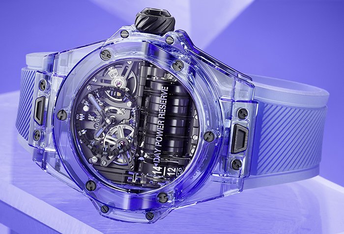 Big Bang MP-11 Blue Sapphire เปิดมุมมองใหม่ให้กับ Big Bang MP-11 แรงบันดาลใจจากเครื่องยนต์รถแข่งที่ได้รับการออกแบบอย่างน่าทึ่งผ่านคริสตัลแซฟไฟร์สีน้ำเงินโปร่งใสที่พัฒนาและผลิตขึ้นโดย Hublot จากองค์ความรู้เฉพาะตัวและความเชี่ยวชาญอย่างสมบูรณ์แบบในกระบวนการผลิต ความแข็งของแซฟไฟร์ต้องใช้กระบวนการตัดและขัดแต่งเฉพาะ โดยตัวเรือนของ Big Bang MP-11 ที่ส่วนกลางตัวเรือนที่นูนขึ้นเฉพาะส่วนและขอบตัวเรือนได้รับการออกแบบให้รองรับกับชุดตลับลาน 7 ตัวที่วางเรียงในแนวนอนนับเป็นอีกความท้าทาย ซึ่ง Hublot ประสบความสำเร็จในผลงานรุ่นก่อนมาแล้ว
