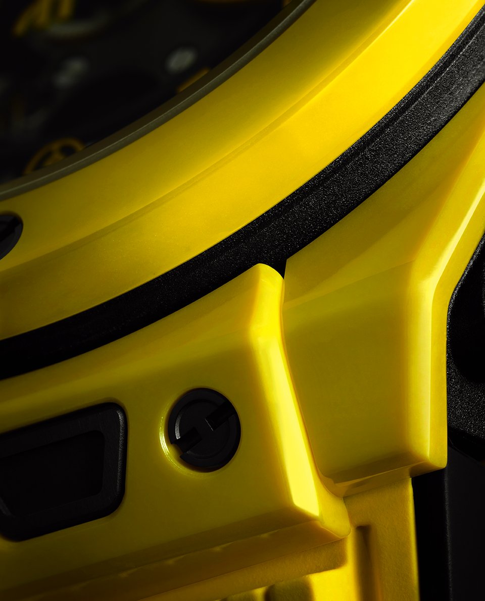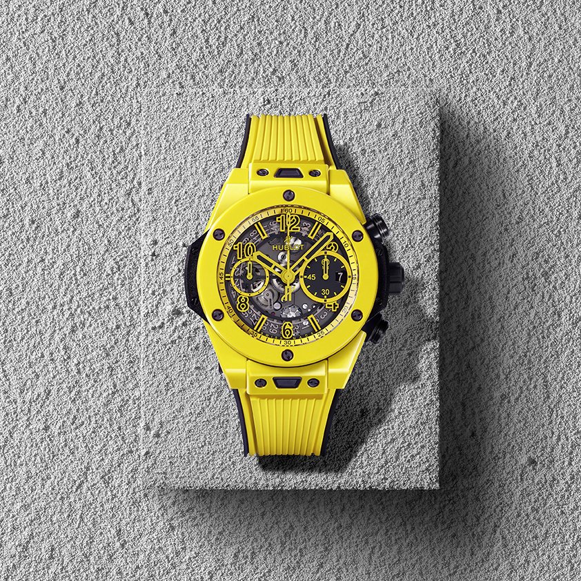 ล่าสุด Hublot สร้างสรรค์เซรามิกสีใหม่ในชื่อ Yellow Magic เป็นสีที่ Hublot พัฒนาและวางกำหนดไว้ล่วงหน้าก่อนการมาถึงของ Red Magic โทนสีที่สดแจ่มผลิตจำกัดเพียง 250 เรือนเท่านั้น เผยความสดใสในตัวเรือนขนาด 42.0 มิลลิเมตร ทั้งตัวเรือนและขอบล้วนเป็นเซรามิก หากเติมอัตลักษณ์ที่โดดเด่นด้วยสกรูตัว H ประดับโดยรอบขอบตัวเรือน 6 ตัว หน้าปัดกึ่งสเกเลตัน ในโครงสร้างเฉดสีเหลืองเช่นเดียวกับตัวเรือน มาพร้อมการแสดงเวลา ฟังก์ชันจับเวลาด้วยเข็มวินาทีพร้อมระบบฟลายแบ็ค และแสดงวันที่ในช่องหน้าต่างที่ 3 นาฬิกา ทำงานด้วยกลไกโครโนกราฟอัตโนมัติ คาลิเบอร์ UNICO HUB1280 ทำงานด้วยความถี่ 28,800 ครั้งต่อชั่วโมง สำรองพลังงานนาน 72 ชั่วโมง ควบคุมการจับเวลาอย่างแม่นยำด้วยจักรคอลัมน์วีลที่เห็นได้จากพื้นหน้าปัดหรือฝาหลังผ่านกระจกคริสตัลแซฟไฟร์ จับคู่กับสายยางสีเหลืองในลายริ้วแถบ ให้เพลินไปกับด้านที่สดใสกับชีวิตได้ตลอดเวลา