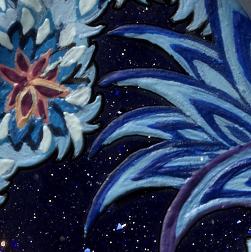 หัวใจสำคัญของการตกแต่งแบบตัดต่อลายไม้ให้มีชีวิตขึ้นมา ต้องใช้ความเอาใจใส่ ความพิถีพิถันและพรสวรรค์ในด้านสีสัน บนฐานของอเวนจูรีนที่แวววาว นักวาดภาพบรรจงร่างโครงของแบบก่อนวางชิ้นส่วนในเตาเผาเพื่อกำหนดสีให้ลงตัว จากนั้นเขาจะสร้างรูปทรงของพืชที่เป็นพื้นหลังโดยใช้การลงสีแบบไมโครเพนต์ติ้ง หรือระบายสีในพื้นที่ขนาดเล็กหลายต่อหลายชั้นด้วยแปรงและทำให้แห้งในเตาเผา เขาดำเนินการในแบบเดียวกันนี้บนพื้นที่สีเรียบก่อนจะจัดองค์ประกอบภาพด้วยสัมผัสที่แม่นยำ ความท้าทายของความพยายามดังกล่าวอยู่ที่การย่อส่วนของขนาดจานสีที่หลากหลาย ความคมชัดและรายละเอียดที่สุดประณีต ต้องใช้ความเข้มงวด ความอดทนและความชำนาญ ในเวลาหลายสัปดาห์เพื่อผลิตหน้าปัดที่เต็มเปี่ยมด้วยเอกลักษณ์แห่งธรรมชาติ