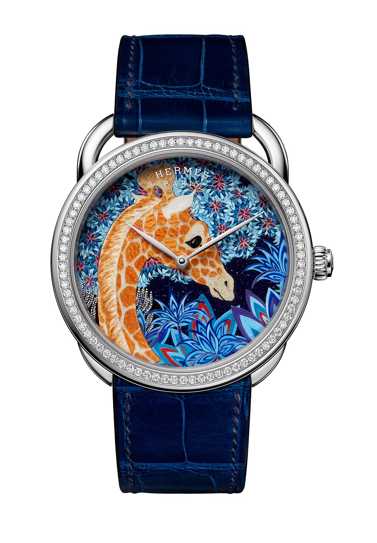 ยีราฟที่งามสง่าประดับบนพื้นหน้าปัดของ Arceau The Three Graces ที่รังสรรค์ขึ้นด้วยเทคนิคการตัดต่อลายไม้ (wood marquetry) และจุลจิตรกรรมหรือภาพวาดขนาดย่อส่วนบนอเวนจูรีน แต่เดิมได้แรงบันดาลใจมาจากทริปการเดินทางสู่แอฟริกาใต้ เมื่ออลิช เชอร์ลีย์ ได้สิทธิพิเศษในการพบเห็นยีราฟสามตัวที่หลบอยู่ที่ต้นอะคาเซีย ความละเอียดอ่อนและบทกวีของสิ่งมีชีวิตขนาดมหึมานี้ พร้อมกับการเคลื่อนไหวอย่างสมบูรณ์แบบและสง่างาม แสดงถึงความโดดเด่นด้วยฝีมือที่เปี่ยมความชำนาญของศิลปินแห่งแอร์เมสผู้สร้างสรรค์ความกลมกลืนตามธรรมชาติของมันขึ้นมาใหม่