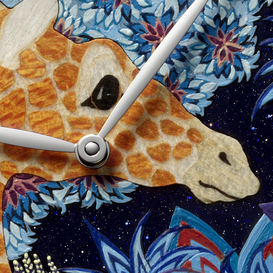ในการเปลี่ยนแปลงรูปร่างของยีราฟ ที่มีลักษณะคอยาวและผิวหนังที่ปกคลุมด้วยลวดลายมาประดับไว้บนพื้นหน้าปัด ผู้เชี่ยวชาญด้านการตัดต่อลายไม้เริ่มต้นจากดีไซน์ในการเปลี่ยนและลดขนาดลงมา จากนั้นจึงเลือกประเภท พื้นผิวและสีสันของแผ่นไม้ที่ใช้ในการสร้างสรรค์ขึ้นมาใหม่ ในกรณีนี้หมายถึงการผสมผสานระหว่างไม้ธรรมชาติที่มีสีเข้ม สีอ่อน ที่นำไปย้อมหรือฟอกขาว ที่ประกอบด้วยเมเปิลและไม้วอลนัทอเมริกัน (American walnut) ไม้ไซคามอร์ของยุโรปและต้นทิวลิป การเลือกใช้ความแตกต่างและพื้นผิว คล้ายกับการออกแบบดั้งเดิม ช่างฝีมือจะตัดไม้ออกเป็นชิ้นส่วนเล็ก ๆ จำนวนมาก ทั้งหมด 195 ชิ้น จะถูกนำมาสร้างภาพเหมือนที่ประกอบขึ้นอย่างน่าฉงน ก่อนจะติดกาว ขัดและเคลือบเงาเพื่อป้องกัน
