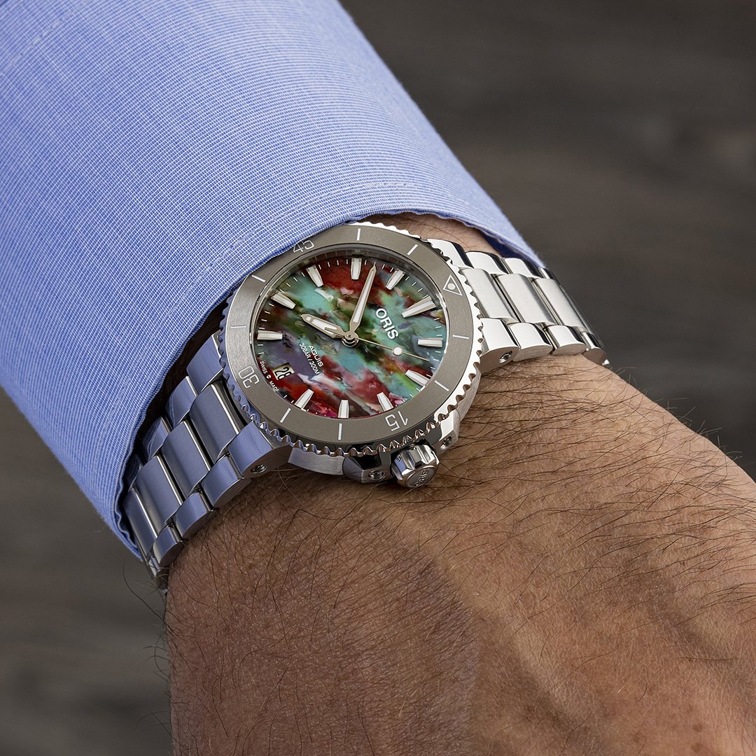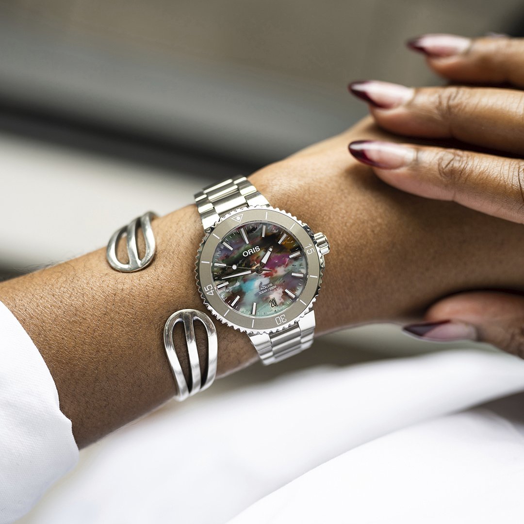 นาฬิกา Aquis Date Upcycle แสดงถึงช่วงเวลาที่โอริสกลายมาเป็นบริษัทที่เป็นมิตรต่อสภาพภูมิอากาศ และเป็นเสมือนกับสัญลักษณ์ของการสานต่อพันธกิจของเราในการปกป้องอนาคตโลกของเรา ด้วยความร่วมมือกันของพวกเราจะสามารถนามาสู่การเปลี่ยนแปลงที่ดีขึ้นได้