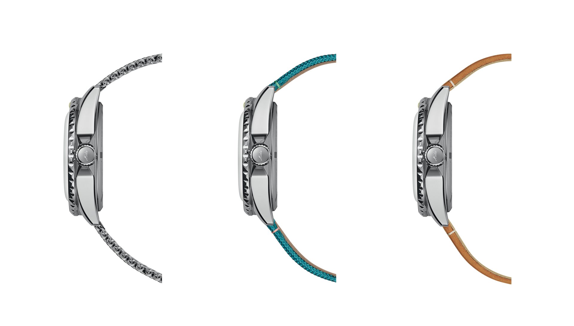 โดยสำหรับผู้ที่ชื่นชอบในความหลากหลายเรือนเวลารุ่นนี้ยังถูกดีไซน์มาพร้อมกับฟังก์ชั่นที่สามารถเปลี่ยนสายได้ ถึง 3 แบบด้วยกัน ไม่ว่าจะเป็นสายถักสเตนเลสสตีล สายหนังเคลือบในโทนสีน้ำตาลสุดสีคลาสสิก และสายผ้าสีเขียวเทอร์ควอยซ์ สไตล์สปอร์ตที่เย็บจากด้ายเฉดสี เดียวกันกับกรอบหน้าปัด ซึ่งมาพร้อมกับระบบเดือยที่ทำให้สามารถเปลี่ยนสายได้อย่างง่ายดาย และรวดเร็ว