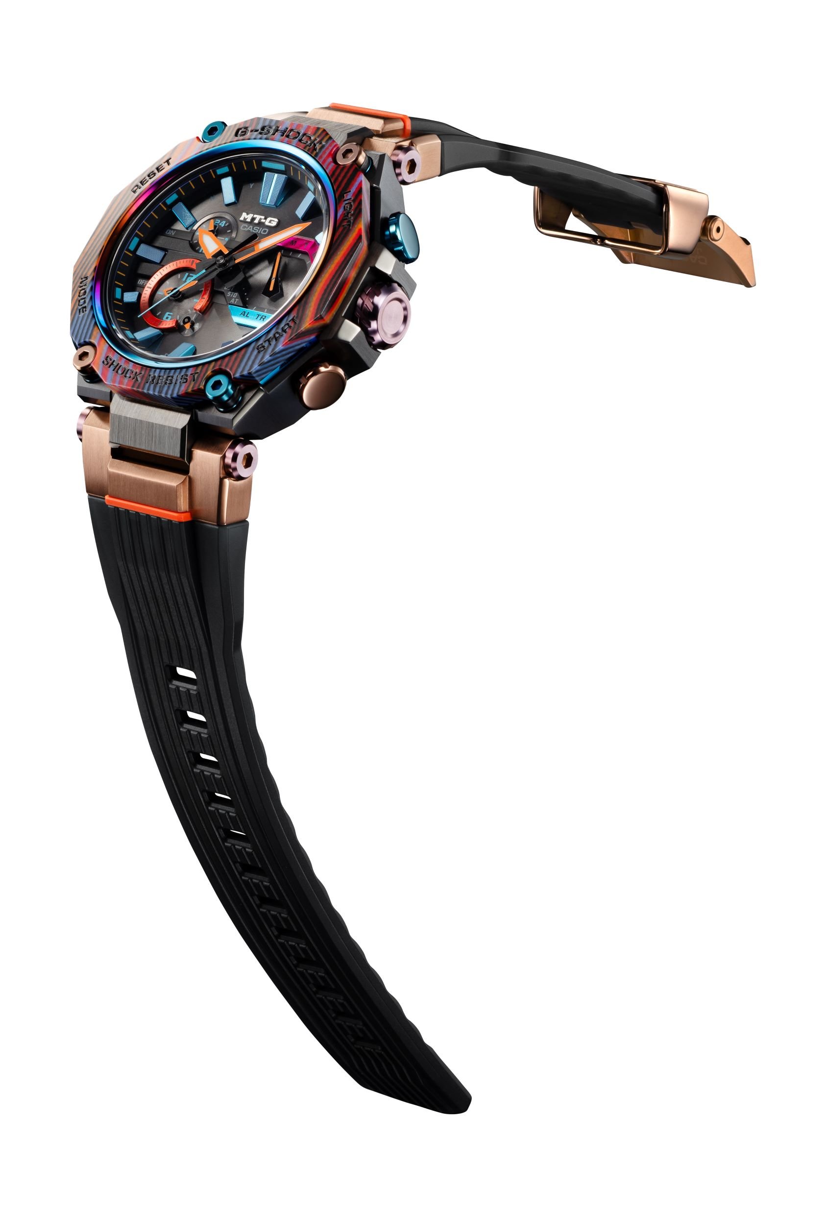 5 พฤศจิกายน 2564 กรุงเทพฯ, ประเทศไทย – บริษัท คาสิโอ คอมพิวเตอร์ จำกัด เผยโฉมนาฬิกา G-SHOCK MTG-B2000XMG รุ่นใหม่ล่าสุด ภายใต้กลุ่มผลิตภัณฑ์นาฬิกาที่ทนทานต่อแรงกระแทก โดดเด่นด้วยดีไซน์ของกรอบตัวเรือนวัสดุคาร์บอนและไฟเบอร์กลาสหลากสีสันดั่งภูเขาสายรุ้งที่เจิดจรัสและสะกดทุกสายตา โดยนาฬิการุ่นล่าสุดนี้ เป็นหนึ่งในนาฬิกาจากกลุ่มพรีเมี่ยม MT-G ซึ่งมีลักษณะเฉพาะในด้านโครงสร้างตัวเรือนที่ผสมผสานวัสดุโลหะ และเรซินรวมเข้าด้วยกัน