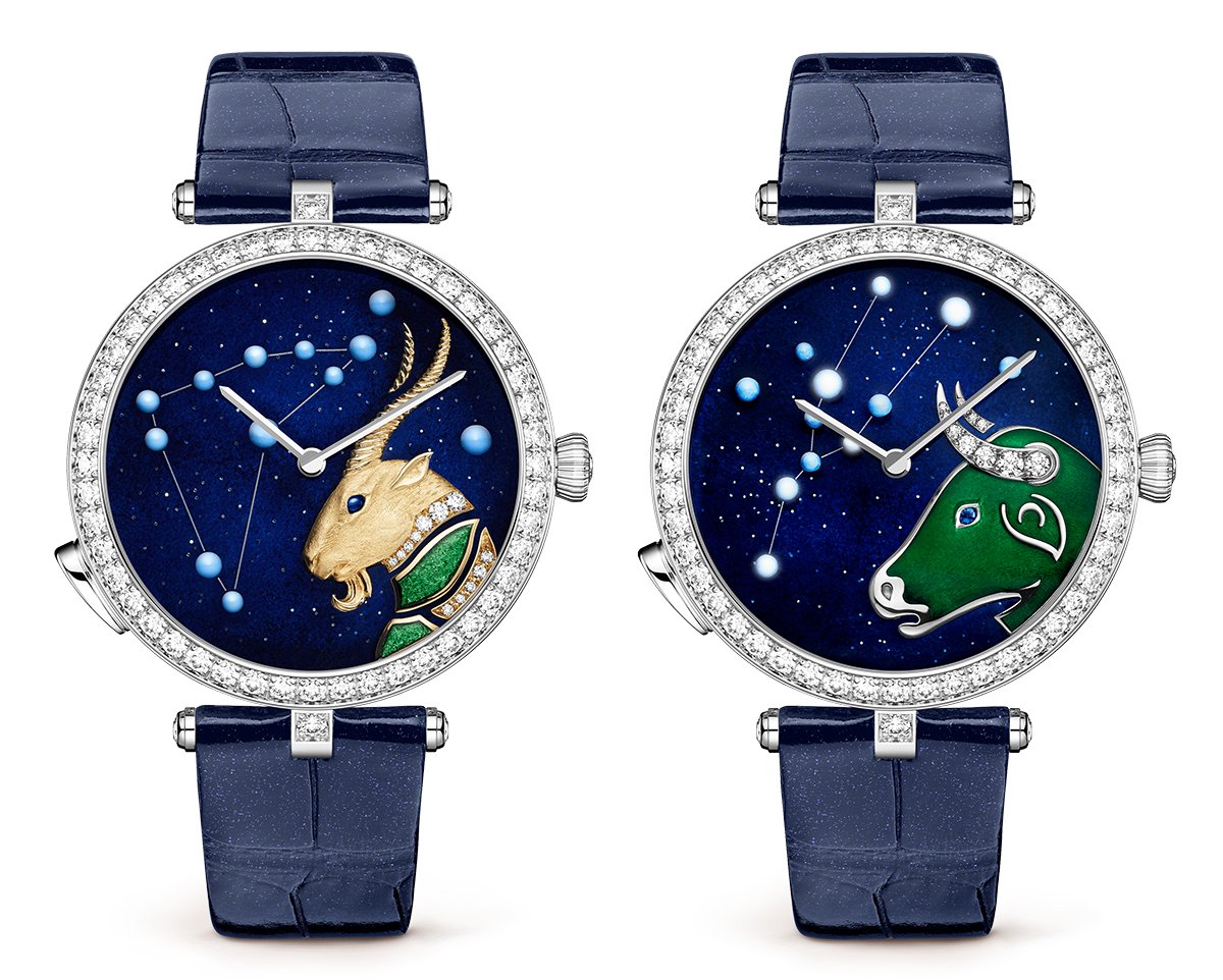 หน้าปัดรุ่นต่างๆ ดุจมีชีวิตโลดแล่นจรัสประกายความงามประดับข้อมือขึ้นได้ก็ด้วยทักษะ ความสามารถเชิงเทคนิค ซึ่งถูกระดมมาใช้ตกแต่งประดับประดารายละเอียดท่ามกลางห้องผลิตงานแผนกต่างๆ ในโรงงานของ Van Cleef & Arpels ที่เขตเทศบางเมืองเมย์แร็ง ประเทศสวิตเซอร์แลนด์ ทองคำขาวถูกนำมาหล่อแบบ สลักเสลาอย่างวิจิตรบรรจงทีละชิ้นๆ สัญลักษณ์ประจำราศีต่างๆ บนนาฬิกาข้อมือบุรุษ โดดเด่นอยู่บนพื้นหน้าปัดลงยาไปแย็ต (pailleté : ลงยาเคลือบเงาแบบแผ่นเลื่อม) สีน้ำเงินเข้มจำลองแบบเฉดสีผืนฟ้ายามราตรี ส่วนนาฬิกาข้อมือสตรี สัญรูปประจำราศีต่างๆ เหล่านี้ล้วนตกแต่งด้วยทองคำขาว หรือทองคำสีเหลืองสุกสกาว ร่วมกับบรรดารัตสชาติเลอค่าและงานลงยาความล้ำลึกของห้วงจักรวาล อาศัยลูกเล่นล้อแสงทอประกายของสีน้ำเงินเข้มเหลื่อมเฉด ร่วมกับงานลงยาเฉดต่างๆ อย่างสีเขียว เพื่อเป็นตัวแทนธาตุดิน, สีส้มคือธาตุไฟ และลีลาไล่ลำดับเฉดของสีฟ้า กับสีม่วงคือธาตุลมและน้ำภายในแต่ละหมู่ดาว ต่างอาศัยลูกปัดลงยาอย่างอ่อนช้อย ละเมียดละไมตกแต่งเป็นตัวแทนตำแหน่งดาวจุดต่างๆ ซึ่งล้วนอาศัยงานฝีมือตะไบรูปทรงให้เกลี้ยงเกลา เช่นเดียวกับงานฝังลงบนแผงหน้าปัด ลูกปัดลงยาบางเม็ดอาศัยเทคนิคในการก่อแสงสว่างได้เหมือนดวงดาวอย่างสมจริง