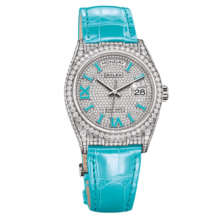 นาฬิกาเรือนสวยในโทนสีหวาน ตัวเรือนทำด้วยทองคำขาว 18 กะรัต พร้อมหน้าปัดประดับเพชรเต็มเรือนและสายหนังจระเข้สีฟ้าเทอร์ควอยซ์ ฟังก์ชั่นและการออกแบบที่โดดเด่นเป็นที่รู้จักในนามของ "นาฬิกาประธานาธิบดี" ที่ทำให้ Oyter Perpetual Day-Date ทอประกายและแต่งแต้มสีสันให้สไตล์ของสาวๆ เหมาะเป็นเรือนคู่ใจผู้นำสุภาพสตรีที่เปี่ยมด้วยความแน่วแน่