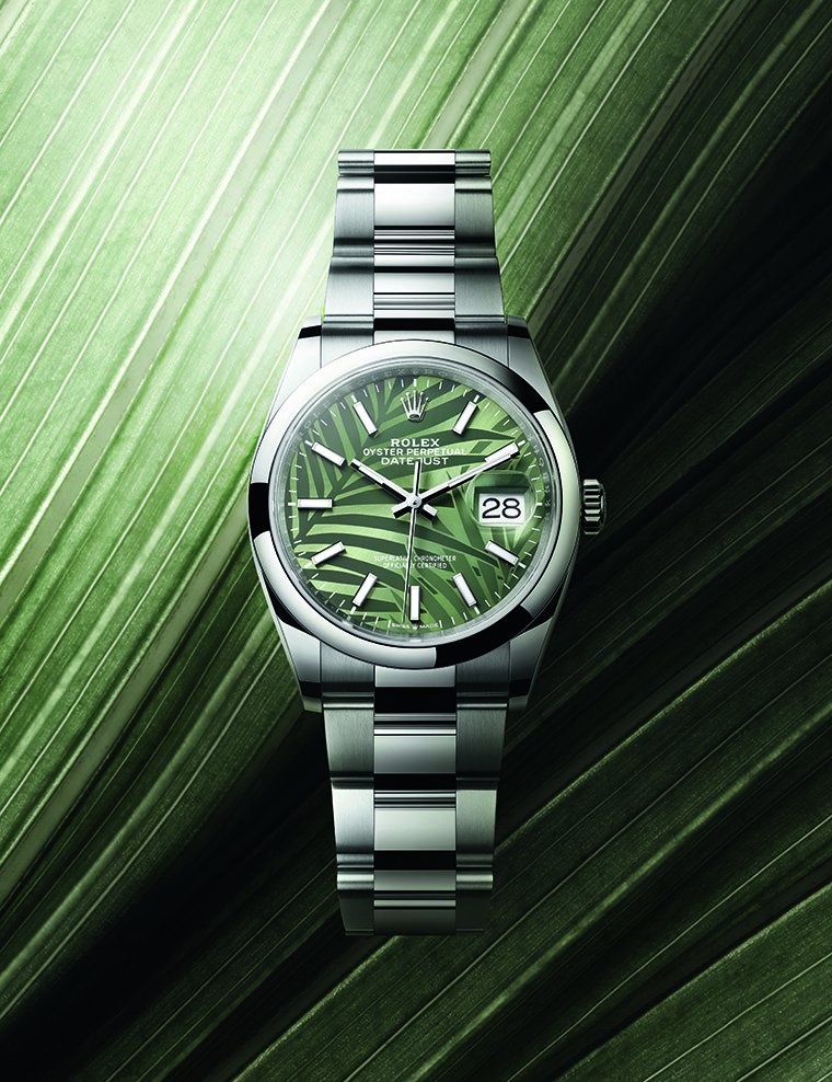 อีกหนึ่งผลงานที่พร้อมจะเป็นคู่ใจร่วมเดินทางท่องเที่ยวในวันหยุด ในตัวเรือนแกร่งทนของ Oystersteel กังหน้าปัดลวดลายต้นปาล์มสีเขียวมะกอกแสนสดชื่น ชวนให้นึกถึงความเขียวชอุ่มที่ประดุจโอเอซิสอันแสดงอบอุ่นสบายใจท่ามกลางความอบอ้าวของเขตร้อน