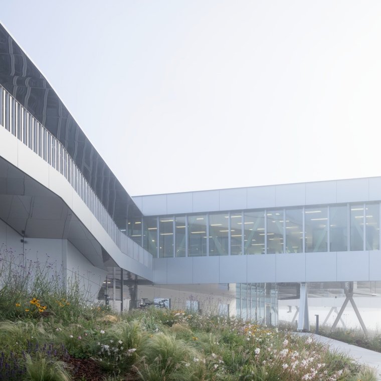 เพื่อเพิ่มชีวิตให้กับส่วนโค้งด้านหน้าของอาคารที่มีความยาว 350 เมตร ทีมสถาปนิกยังได้แนะนำระบบกรอบโลหะที่ช่วยลดความเสี่ยงในการชนของนกและลดแสงสะท้อนที่ทำให้ผู้ใช้อาคารไม่สบายตา นอกจากนี้ยังแก้ไขกรณีน้ำท่วมที่อาจเกิดขึ้นด้วยการยกตัวอาคารขึ้นสูง 80 เซนติเมตร ซึ่งน้ำสามารถไหลผ่านไปตามทางน้ำตามธรรมชาติโดยสภาพภูมิประเทศเดิมไม่ถูกเปลี่ยนแปลง และอาคาร Arc นี้ถูกสร้างห่างจากสถานีรถไฟเลอ บราซูส์ เพียงไม่กี่ก้าวซึ่งช่วยอำนวยความสะดวกเรื่องที่จอดรถให้ผู้คนที่มาร่วมกิจกรรมสุดสัปดาห์ อีกทั้งบริษัทยังได้จัดทำโปรแกรมคาร์พูลในองค์กรและเพิ่มการทำงานระยะไกลสำหรับงานบางตำแหน่งด้วย