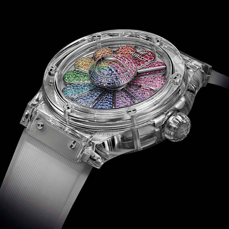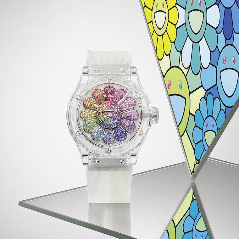 หลังการเปิดตัวเรือนเวลารุ่นแรกเมื่อต้นปีที่ผ่านมา ในเวอร์ชั่น All Black (ออล แบล็ก) ซึ่งได้กลายเป็นสิ่งที่บรรดานักสะสมตามหาทันที ในวันนี้ Hublot และTakashi Murakami จึงได้เดินหน้าสานต่อการตีความจากโลกความน่ารักสไตล์ Kawaii (คาวาอี) ของศิลปินแห่งแดนอาทิตย์อุทัยสู่โลกแห่งเครื่องบอกเวลา โดยการเปิดตัวนาฬิการุ่นใหม่ใน Classic Fusion Takashi Murakami Sapphire Rainbow ซึ่งยังคงมีพื้นฐานมาจากภาพดอกมุราคามิ ดอกไม้ยิ้มแย้มแจ่มใสอันเป็นธีมไอคอนิกภายในผลงานสร้างสรรค์ของ Murakami ที่ได้เปลี่ยนจากสีดำมาสู่สีสันและมิติแห่งความโปร่งใส