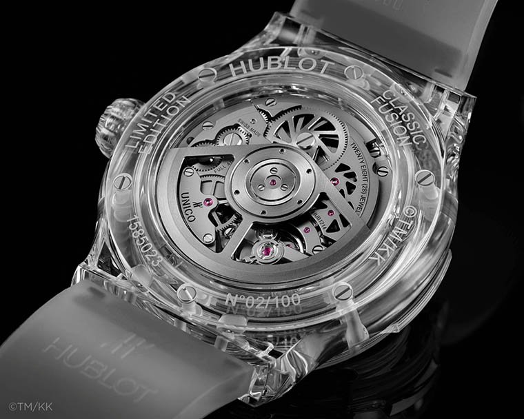 โดยทีมช่างเทคนิคภายในห้องปฏิบัติการของ Hublot ได้ร่วมมือกันสร้างสรรค์การประดับตกแต่งอันมีเอกลักษณ์ไว้ในผลงานแห่งศิลปะชิ้นใหม่นี้ ด้วยแบ็กกราวน์แบบโปร่งใสที่สามารถชื่นชมได้ทั้งงานศิลปะของศิลปินและจักรกลอันซับซ้อนที่รังสรรค์ขึ้นโดยช่างนาฬิกาแห่งเมือง Nyon (นียง) โดยได้นำเอาบุคลิกและความโดดเด่นของรุ่น Classic Fusion (คลาสสิค ฟิวชั่น) กลับมานำเสนออีกครั้ง ภายใต้ตัวเรือนขนาดเส้นผ่านศูนย์กลาง 45 มม. ทำจากแซฟไฟร์ ซึ่งเป็นหนึ่งในชัยชนะทางด้านเทคนิกที่บุกเบิกไว้โดย Hublot