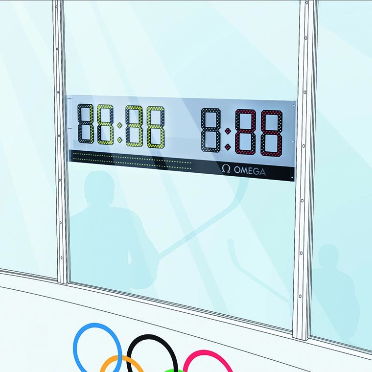 OMEGA ได้เปิดตัวการแสดงผลในการแข่งขันแบบใหม่สำหรับกีฬาฮ็อกกี้น้ำแข็ง ด้วยการผสานระบบ LED เข้ากับเพล็กซีกลาสรอบสนาม นาฬิกาที่โปร่งใสด้านเดียวจะแสดงเวลาการแข่งขันกับการทดเวลาโดยติดตั้งอยู่ระหว่างสองกรอบเขตโทษ การแสดงผลจะมอบประโยชน์อย่างมหาศาลให้กับผู้เล่นที่ตอนนี้จะได้รับข้อมูลสำคัญเหล่านี้ตลอดการแข่งขัน