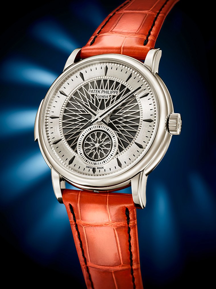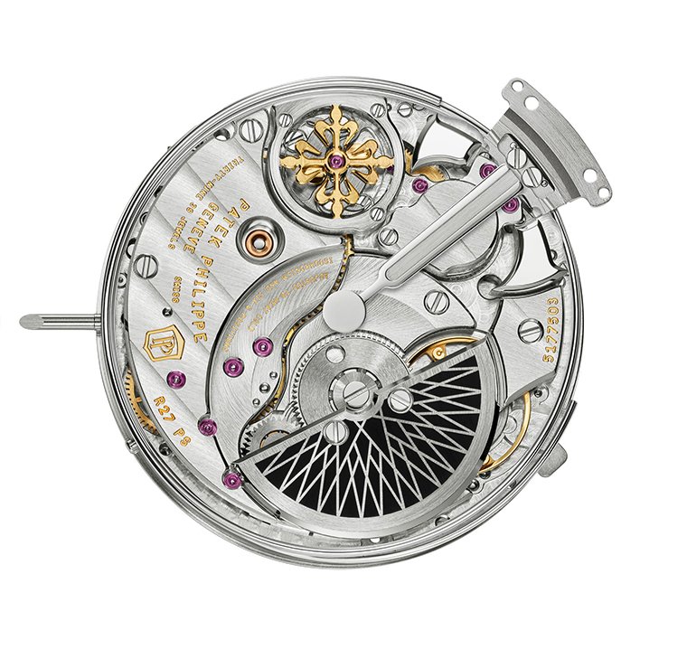 ฝาหลังกระจกแซฟไฟร์ถ่ายทอดให้เห็นภาพของค้อนและลวดฆ้องคลาสสิกของจักรกลมินิท รีพีทเตอร์ เช่นเดียวกับคานเสียงด้วยรูปทรงคล้ายส้อมเสียงที่ประกอบเข้ากับแผ่นออสซิลเลเตอร์โปร่งใสของระบบขยายเสียง fortissimo ส่วนบนตัวครอบของตัวเหวี่ยงหนีศูนย์กลาง (Centrifugal governor) ตกแต่งด้วยสัญลักษณ์ Calatrava Cross ฉลุโปร่ง ซึ่งมั่นใจได้ถึงจังหวะที่สม่ําเสมอของเสียงดีบอกเวลา ขณะที่ภาพอันงดงามโดดเด่นยังเปิดโชว์ให้เห็นทั้งบาลานซ์สปริง Gyromax® ทําจาก Silinvar® โดย Patek Philippe “Advanced Research” ซึ่งเปิดตัวในปี ค.ศ. 2006 เช่นเดียวกับสะพานจักรขนาดใหญ่พร้อมด้วยงานตกแต่งลวดลาย Geneva striping และขอบขัดขึ้นมุมและขัดเงาอย่างพิถีพิถันละเอียดอ่อน รวมถึงมินิโรเตอร์แพลทินัมที่สวยเด่นด้วยลวดลายรัศมีสไตล์เดียวกันกับหน้าปัด สร้างสรรค์ขึ้นด้วยเทคนิคลวดลายพื้นผิวที่ดูดซับแสงโดยใช้เลเซอร์ ทําให้ส่วนต่างๆ บนพื้นผิวนั้นปรากฏเป็นสีดํา สําหรับ นาฬิการุ่นผลิตจํานวนจํากัดแบบพิเศษนี้จะประกอบคู่มากับสายหนังจระเข้สีส้มเงาวาว ตัดด้วยตะเข็บสายสีดําและตัวล็อกสายแบบบาน พับซึ่งทําจากแพลทินัม