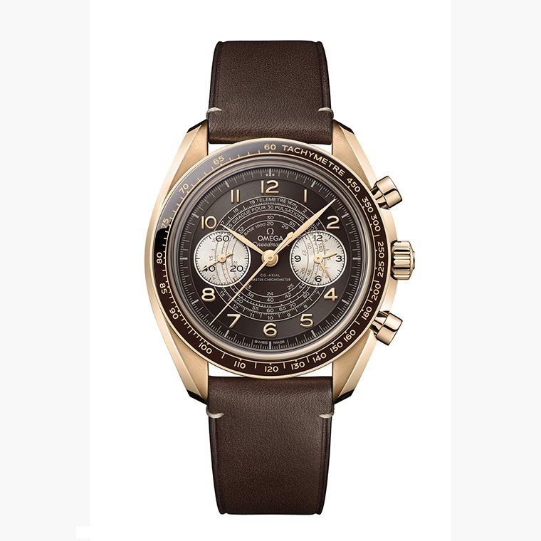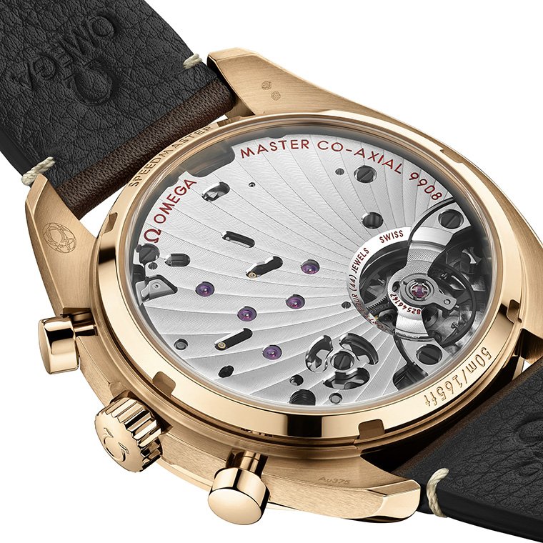 นาฬิกา OMEGA Speedmaster สี Bronze Gold ขนาด 43 มม.ที่ปรากฏในมิวสิควิดีโอ ถูกอัดแน่นไปด้วยรายละเอียดที่เป็นเอกลักษณ์มากมาย ทั้งหน้าปัดแบบพิมพ์และสามสเกลเวลาที่สะกดสายตา ผ่านรายละเอียดการออกแบบหน้าปัดแบบ “หอยทาก” และชุดเข็มทรงใบไม้ที่กับรางนาทีแบบ “เวียน” ที่จัดเรียงอย่างวิจิตรภายใต้หลักเลขอารบิกบนหน้าปัด เมื่อพลิกไปที่ด้านหลังก็จะพบกับกลไกไขลาน OMEGA Co-Axial Master Chronometer Calibre 9908 ที่ซุกซ่อนอยู่หลังกระจกแซฟไฟร์ที่ได้รับการตกแต่งอย่างประณีต ด้วยการรับรองระดับ Master Chronometer ทั้งกลไกและนาฬิกาได้ถูกทดสอบภายใต้สภาวะที่สุดขั้วที่ตั้งขึ้นจากการทดสอบที่เข้มงวดที่สุดของอุตสาหกรรมโดย Swiss Federal Institute of Metrology (METAS)