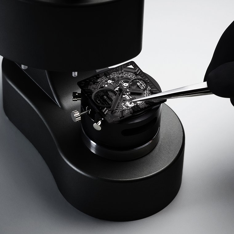 Hublot ตัดสินใจที่จะใช้ทิศทางที่แตกต่างไปจากเดิมอย่างสิ้นเชิง: ช่างผลิตนาฬิกาของเราไม่ปกปิดกลไก Unico ที่ผลิตขึ้นภายในโรงงานของเราเอง ซึ่งเป็นความภาคภูมิใจของช่างผลิตนาฬิกาแห่งเมือง Nyon และเป็นหัวใจสำคัญในการออกแบบส่วนใหญ่มานานกว่า 10 ปี กลไกโครโนกราฟที่มีคอลัมน์ วีลล์ซึ่งสามารถมองเห็นได้ ณ ตำแหน่ง 6 นาฬิกา ขณะที่ระบบ bicompax (ไบคอมแพค) เผยอยู่บนหน้าปัดเพื่อให้เห็นการทำงานภายในที่เป็นความลับ