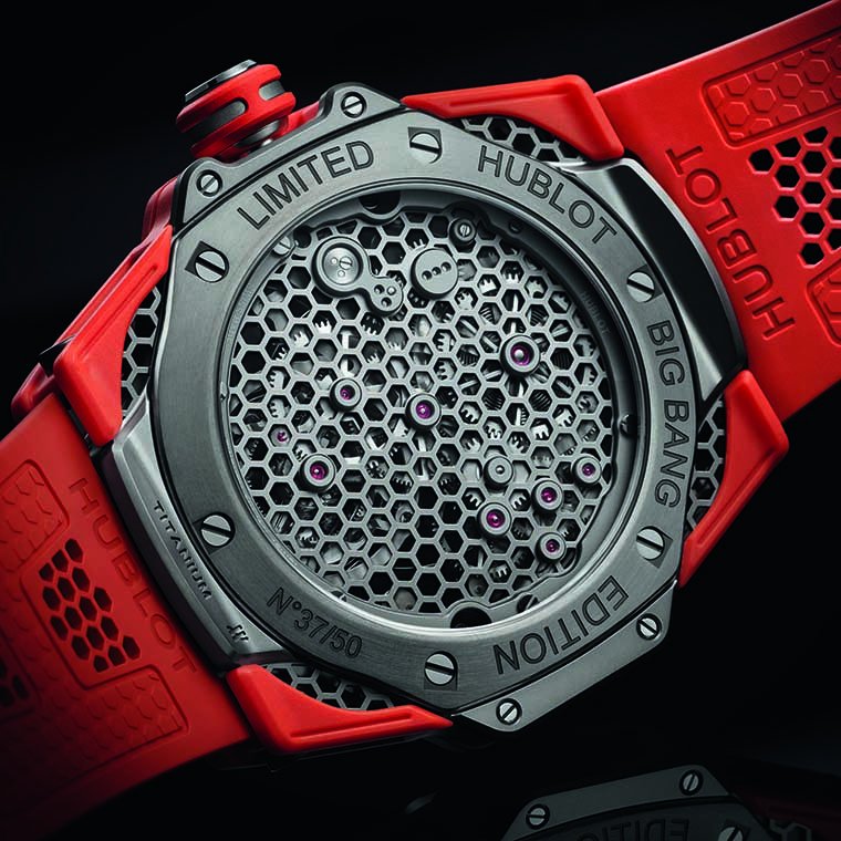 รูปทรงหกเหลี่ยมที่เปี่ยมด้วยสไตล์และโดดเด่นเฉพาะตัวของตัวเรือน Big Bang (บิ๊ก แบง) นั้น ได้ถูกสะท้อนผ่านลวดลายถักรวงผึ้งทำจากไทเทเนียมที่อยู่บนหน้าปัด ตัวเรือน ฝาหลัง และสายนาฬิกา ด้วยโครงสร้างบล็อกตามธรรมชาติ (ที่พบเห็นได้จากสิ่งแวดล้อมมากมาย นับตั้งแต่รวงผึ้งและเกล็ดงู ตลอดไปจนถึงผิวของสับปะรดและเกล็ดหิมะ) รูปทรงอันเข้มแข็งและทรงประสิทธิภาพที่ถูกสร้างขึ้นซ้ำๆ โดยไร้ซึ่งช่องว่างหรือการทับซ้อนกัน ได้กลายเป็นรูปทรงที่เป็นมาตรฐานของโครงสร้างและงานออกแบบสมัยใหม่ อันเป็นผลลัพธ์มาจากความเข้ากันได้อย่างเหมาะเจาะอย่างไร้ที่ติของแต่ละหน่วย
