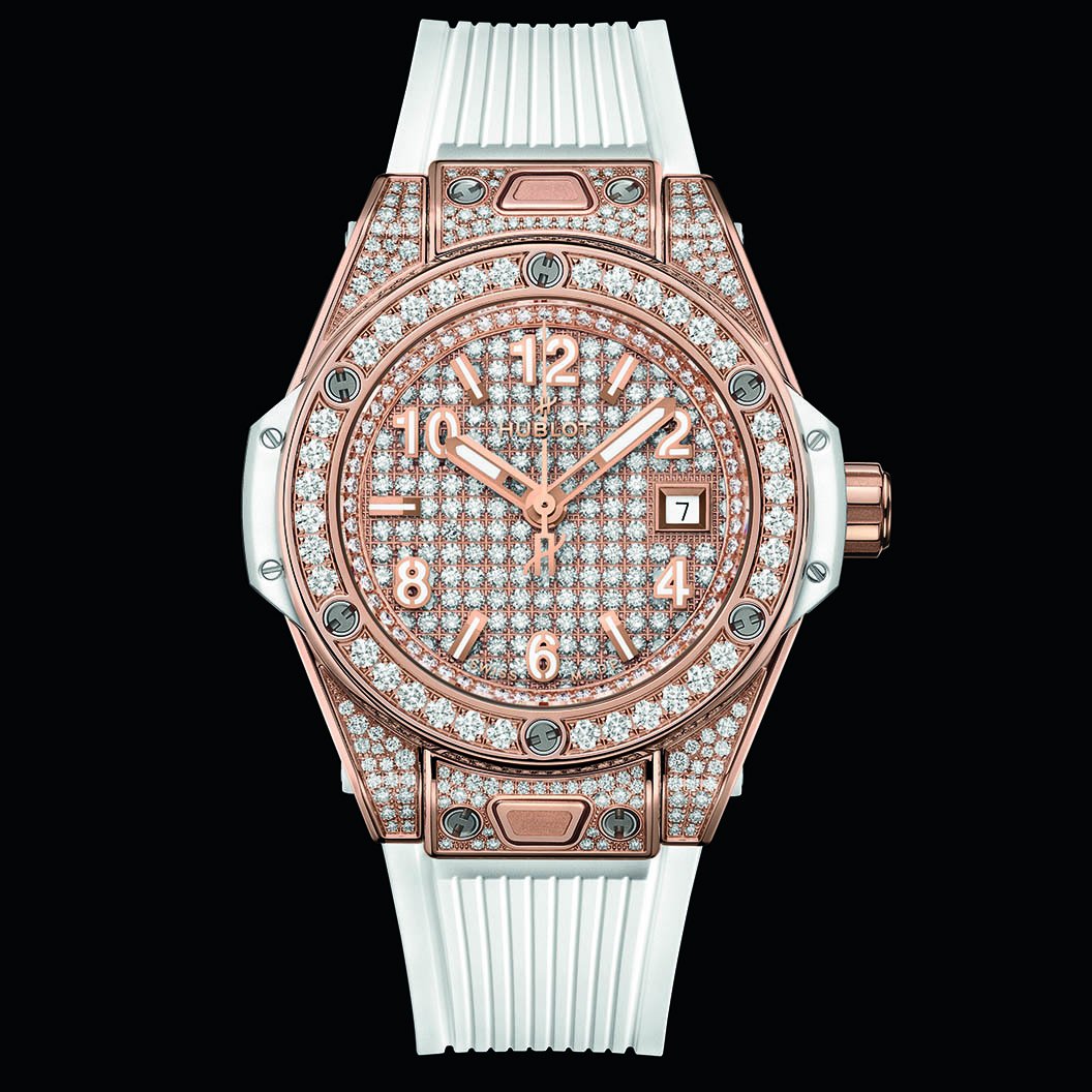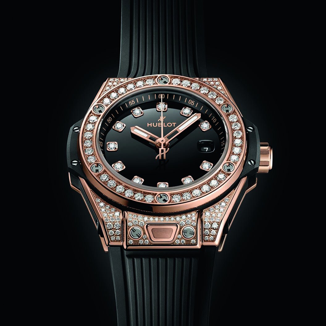 นาฬิกาไอคอนิคอย่าง Big Bang Unico ได้ส่งต่อบุคลิกอันเข้มแข็งให้กับผลงานเหล่านี้ แต่ Big Bang One Click 33mm ใหม่ต่างมีความทันสมัยและสง่างามเฉพาะตัว โดยมีต้นแบบมาจากเครื่องประดับอัญมณีอันประณีตงดงาม รวมถึงงานฝีมือในการรังสรรค์เครื่องประดับอัญมณี ที่กล้าซึ่งจะฉีกออกจากประเพณี จากความสง่างามของขอบตัวเรือนประดับตกแต่งด้วยอัญมณีสวยเด่น พร้อมไฮไลต์ด้วยเครื่องหมายบหรือมาร์กเกอร์บอกชั่วโมงที่ประดับไว้ด้วยเพชร 11 เม็ดรายล้อมรอบหน้าปัด ปล่อยไว้เพียง ณ ตำแหน่ง 3 นาฬิกาสำหรับการแสดงวันที่ ซึ่งในเวอร์ชันเอกซ์คลูซีฟสูงสุดจะมีตัวเรือนประดับเรียงรายไว้ด้วยอัญมณีล้ำค่าอันเป็นนิรันดร์ ภายในบรรจุด้วยหัวใจขับเคลื่อนของกลไกจักรกลไขลานอัตโนมัติ HUB1120 ความถี่ 28,800 ครั้งต่อชั่วโมง และสำรองพลังงานได้ 40 ชั่วโมงต่อเนื่อง